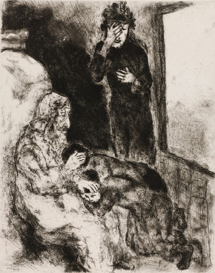 在夏加爾《雅各祝福約瑟的兒子》這幅蝕刻版畫中,約瑟居於畫面最中間的位置,他的確已經是當時最有影響力的人物,從被兄長迫害到成為埃及的宰相,並且拯救了以色列。他站在雅各祝福的現場,不自覺充滿了內心的驕傲,希望以自己的意願影響父親。以至於在雅各雙手交叉祝福的那一刻,夏加爾描繪的約瑟用手遮眼,不敢面對。但「耶和華說:我的意念非同你們的意念;我的道路非同你們的道路。天怎樣高過地,照樣,我的道路高過你們的道路;我的意念高過你們的意念。」(《以賽亞書》五十五章8-9節)