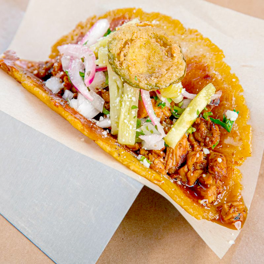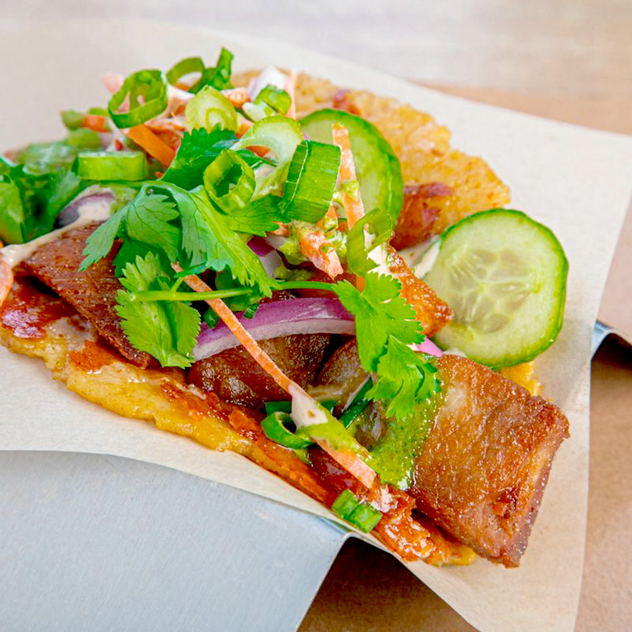 用油炸過豬皮、豬肉或五花肉(Pork Belly)來包薄餅,加上配菜。Chicharrones源自西班牙安達露西亞省,那省出了很多名菜,如番茄冷湯、Serrano燻火腿等。Chicharrones後來流行於秘魯、委內瑞拉,這南美洲常見的小菜。用來包薄餅,加上各餐館廚師特製的醬料,吃來粗獷飽足。