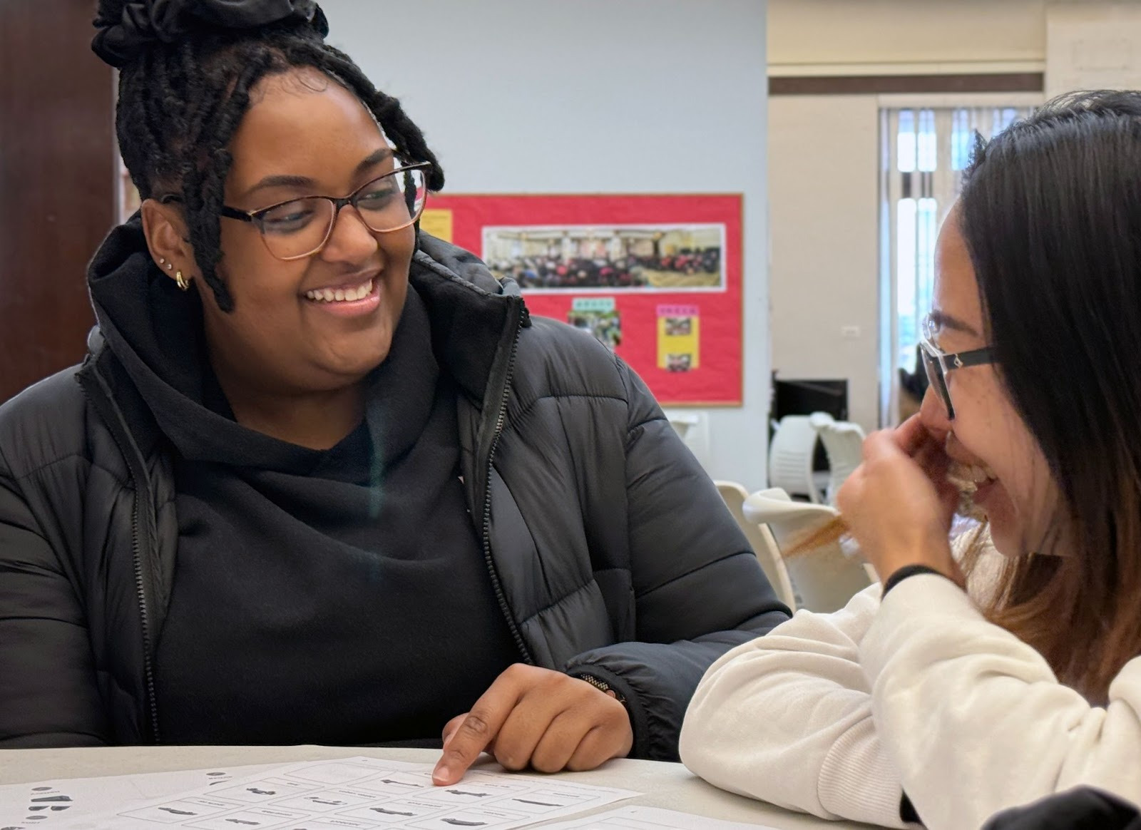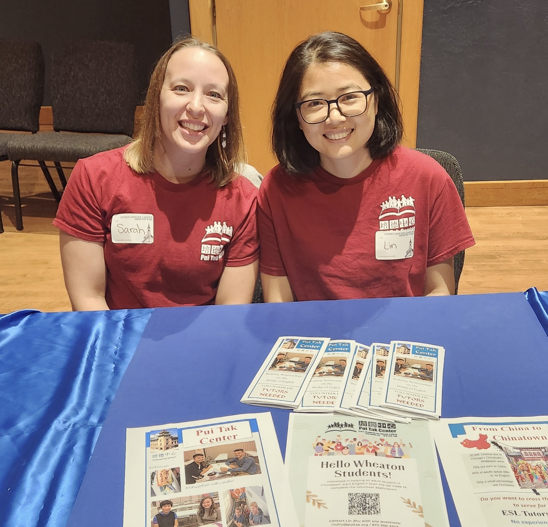 林珠(右)與黃莎莎(左)參加惠頓學院學生事工博覽會培德中心成人英語輔導課程全面展開!我們正積極招募與培訓新導師。9月初,輔導協調員林珠與成人教育項目經理黃莎莎參加了惠頓學院學生事工博覽會,並為來自慕迪聖經學院的學生義工舉辦培訓課程。我們的老師非常期待與學生建立亦師亦友的關係。有興趣申請一對一免費英語輔導的學生,請瀏覽puitak.org/zh/tutoring。