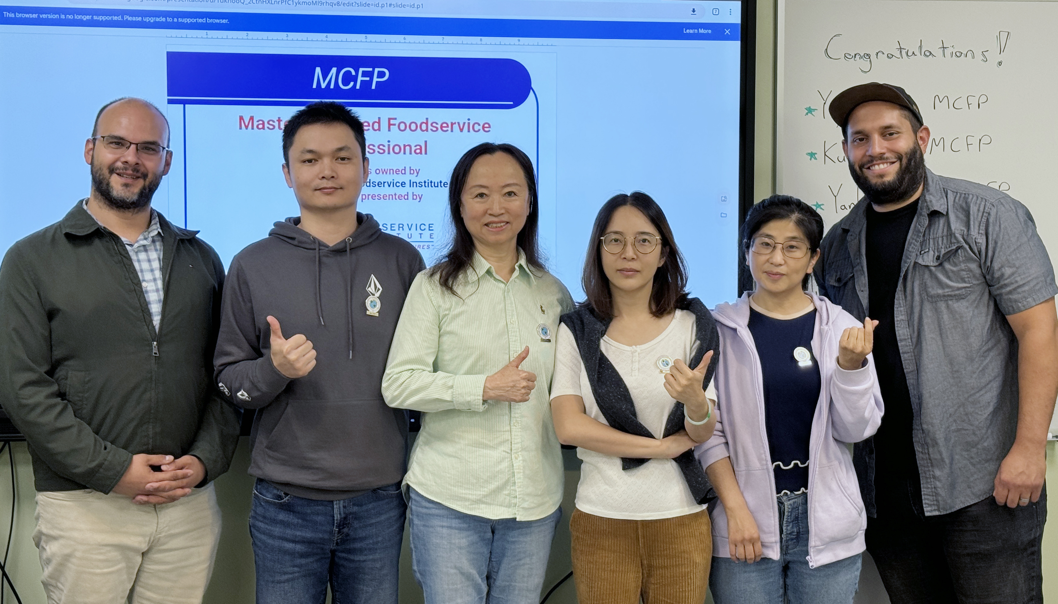 Jotam Torres(右一)與獲取徽章的學員及協調員Jonathan(左一)合照培德中心最新一屆「餐飲服務管理(FSM)」課程於十月圓滿結束,共有7位學員成功通過考試,獲頒業界認可的「高級認證餐飲專業人員(MCFP)」資格,為歷來人數最多的一屆。
