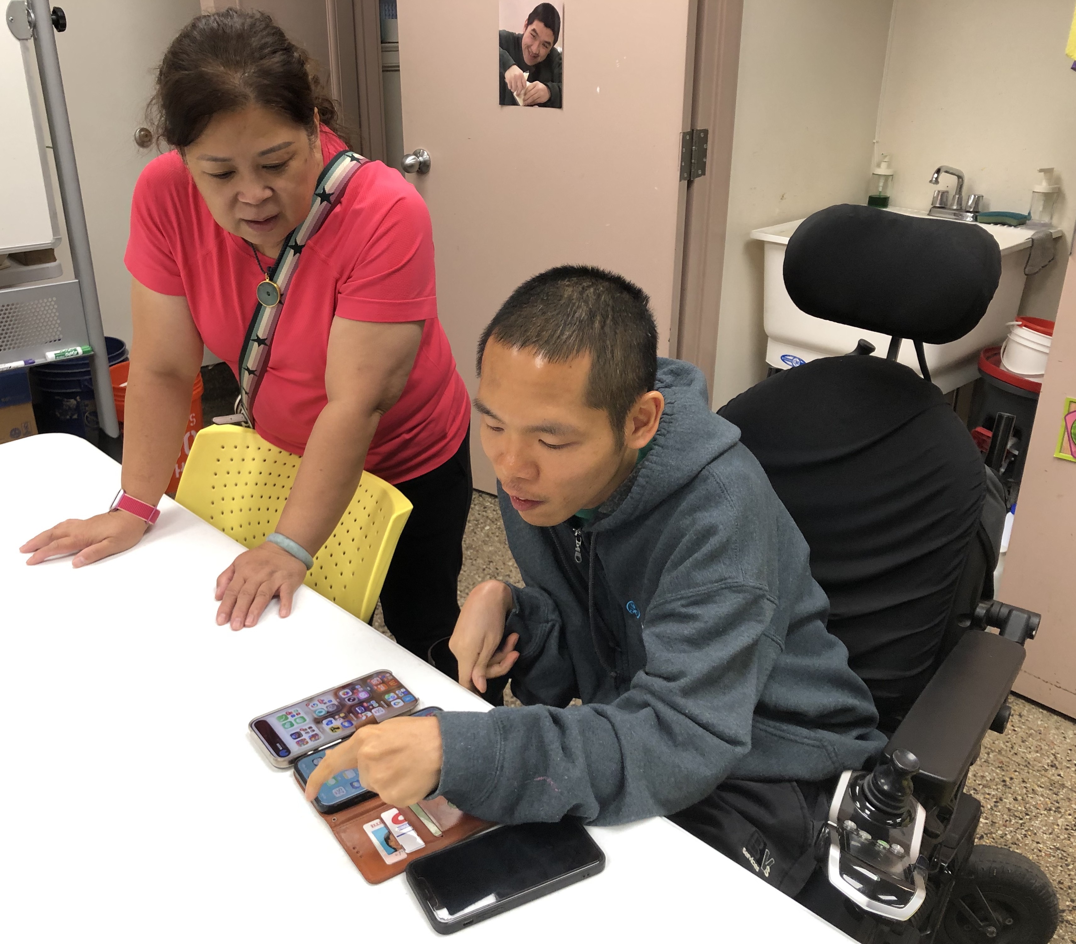達文幫助幾位身心障礙孩子的母親,在手機上安裝《聖經》應用程式。