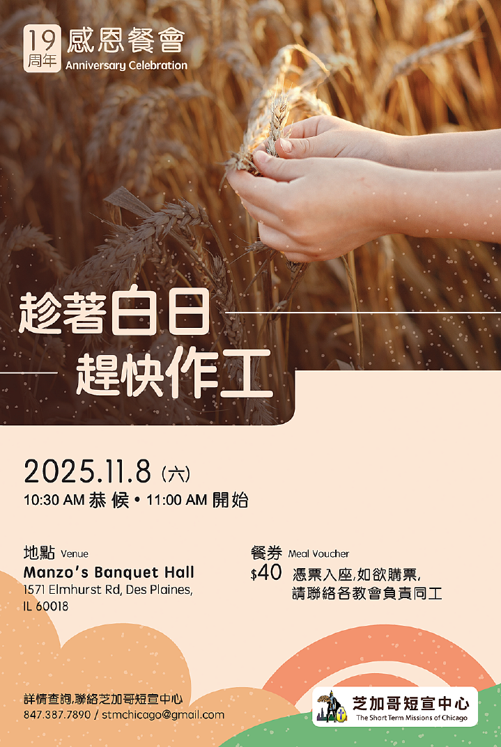 芝宣週年感恩餐會芝加哥短宣中心舉辦19週年感恩餐會,購票請聯絡所屬教會負責同工。