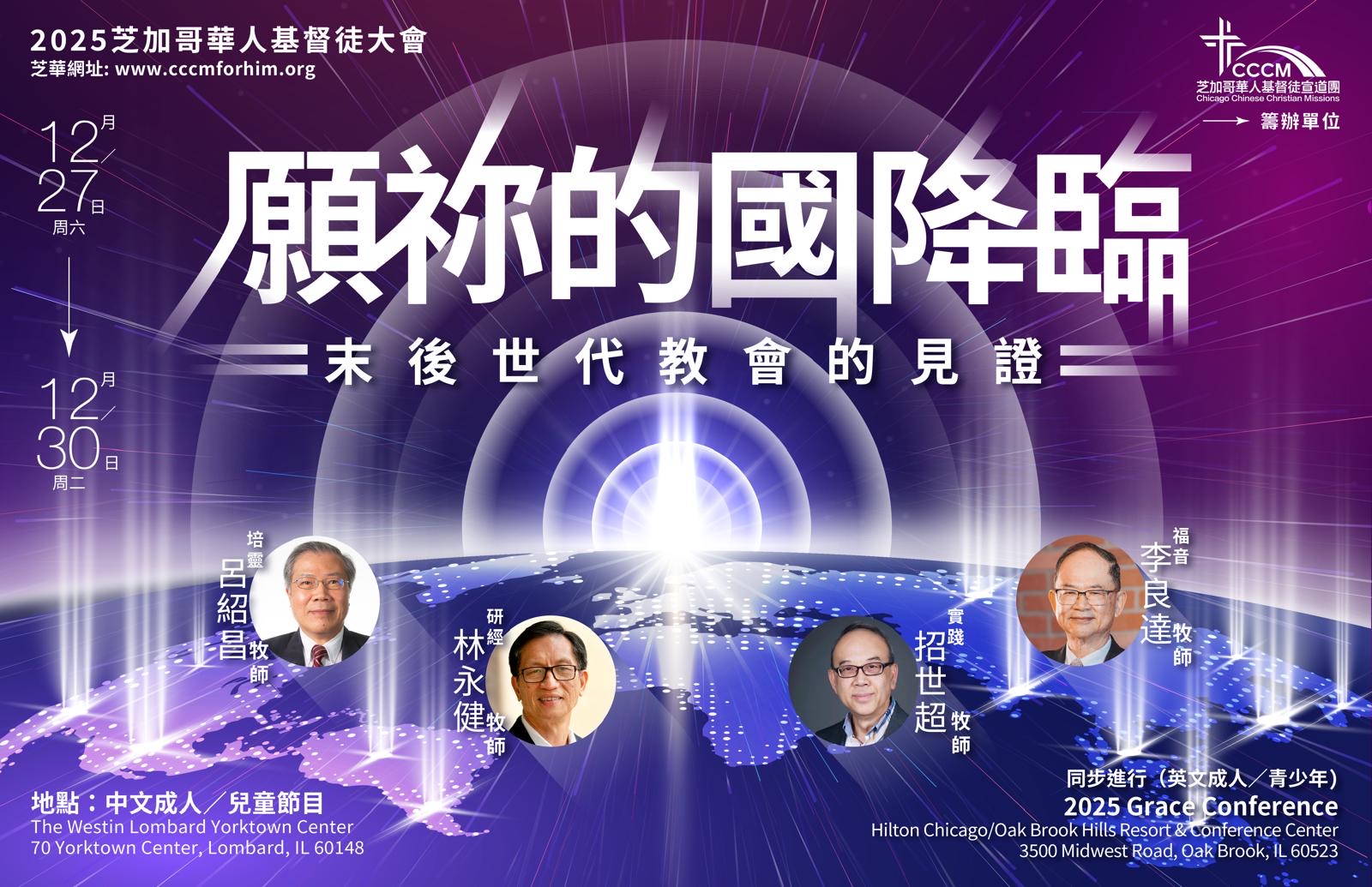 2025年「芝加哥華人基督徒大會」將於12月27-30日舉行,主題為「願祢的國降臨——末後世代教會的見證」。大會特別邀請了呂紹昌牧師、林永健牧師、招世超牧師及李良達牧師等17位講員,主講28堂專題信息,帶領弟兄姊妹深入探討靈命成長、家庭職場、宣教事奉等切身主題。