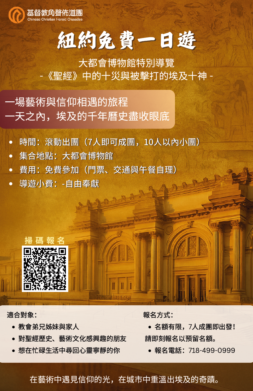 角聲多年舉辦福音旅遊,今年秋季推出新路綫:「大都會博物館深度遊」——一趟藝術與信仰相遇的旅程。