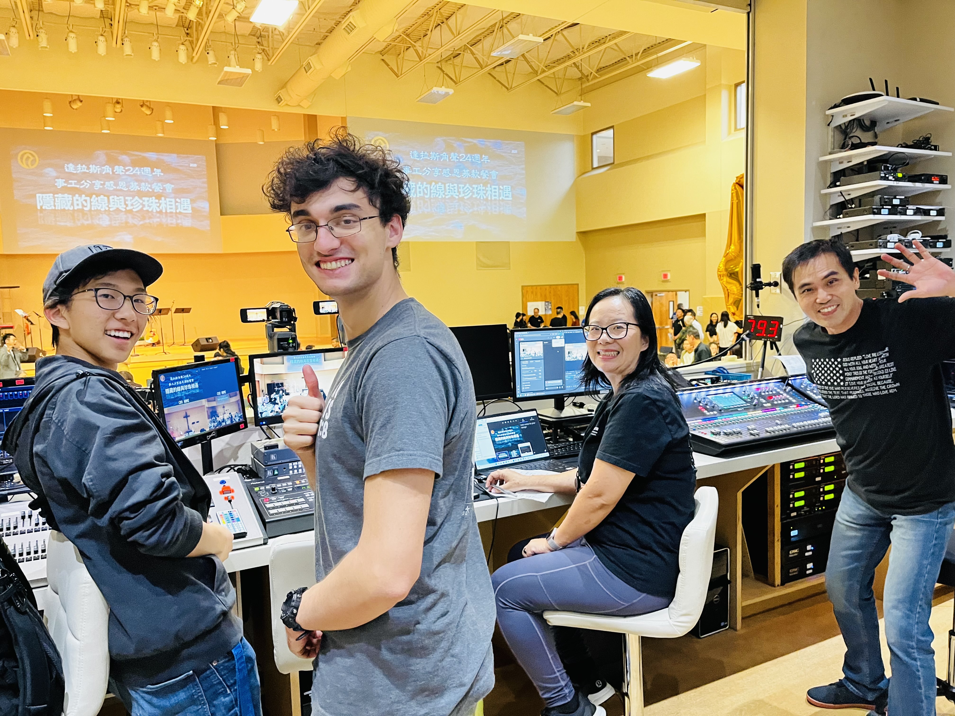 媒體團隊為表達角聲的溫情與身分認同,我們特地設計印有角聲Logo的筷子,盼弟兄姊妹平日用餐時看見Logo能想起角聲事工與見證。飯盒菜品、甜點擺盤,精緻用心;390份餐點整齊送至會場,沒有一份漏出、灑出,連溫度都保持得恰到好處,背後是眾多默默付出的手。來自不同教會40多位義工與同工參與服事,場地佈置、接待簽到、後台協調,都在主愛裡同心合一,忙碌中仍面帶笑容,我心裡無比感動——這正是「隱藏的線」的真實寫照。