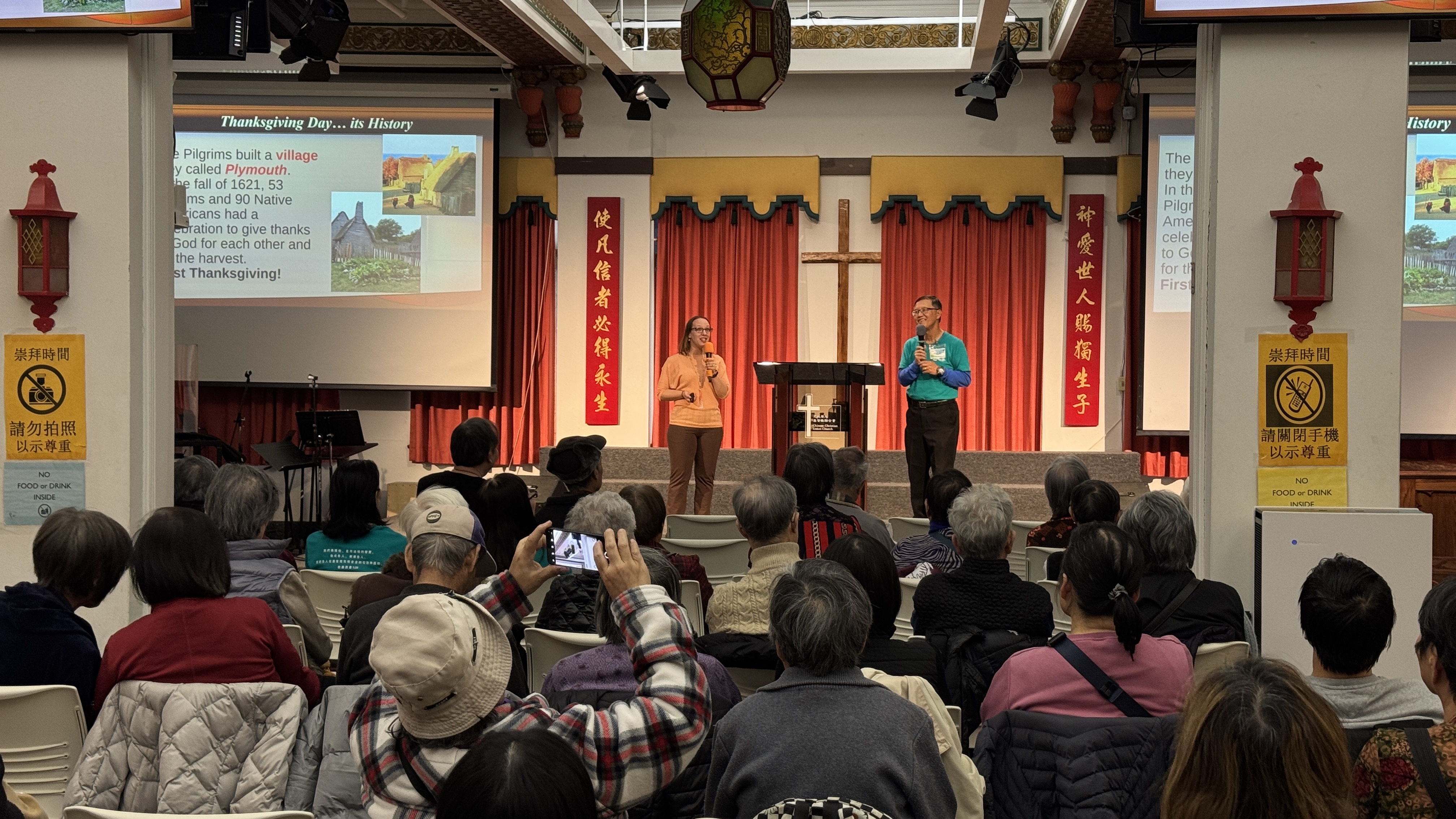 國語聚會由Nikki老師精心策劃的破冰遊戲揭開序幕,參加者積極投入各項挑戰。其後,大家以中、英雙語同唱感恩讚美詩歌;國語堂舞蹈隊亦帶來精彩演出。一如既往,黃莎莎校長分享了美國感恩節的歷史和傳統,以及與感恩節晚餐相關的英語詞彙,讓參加者在歡聲笑語中學習美國文化。