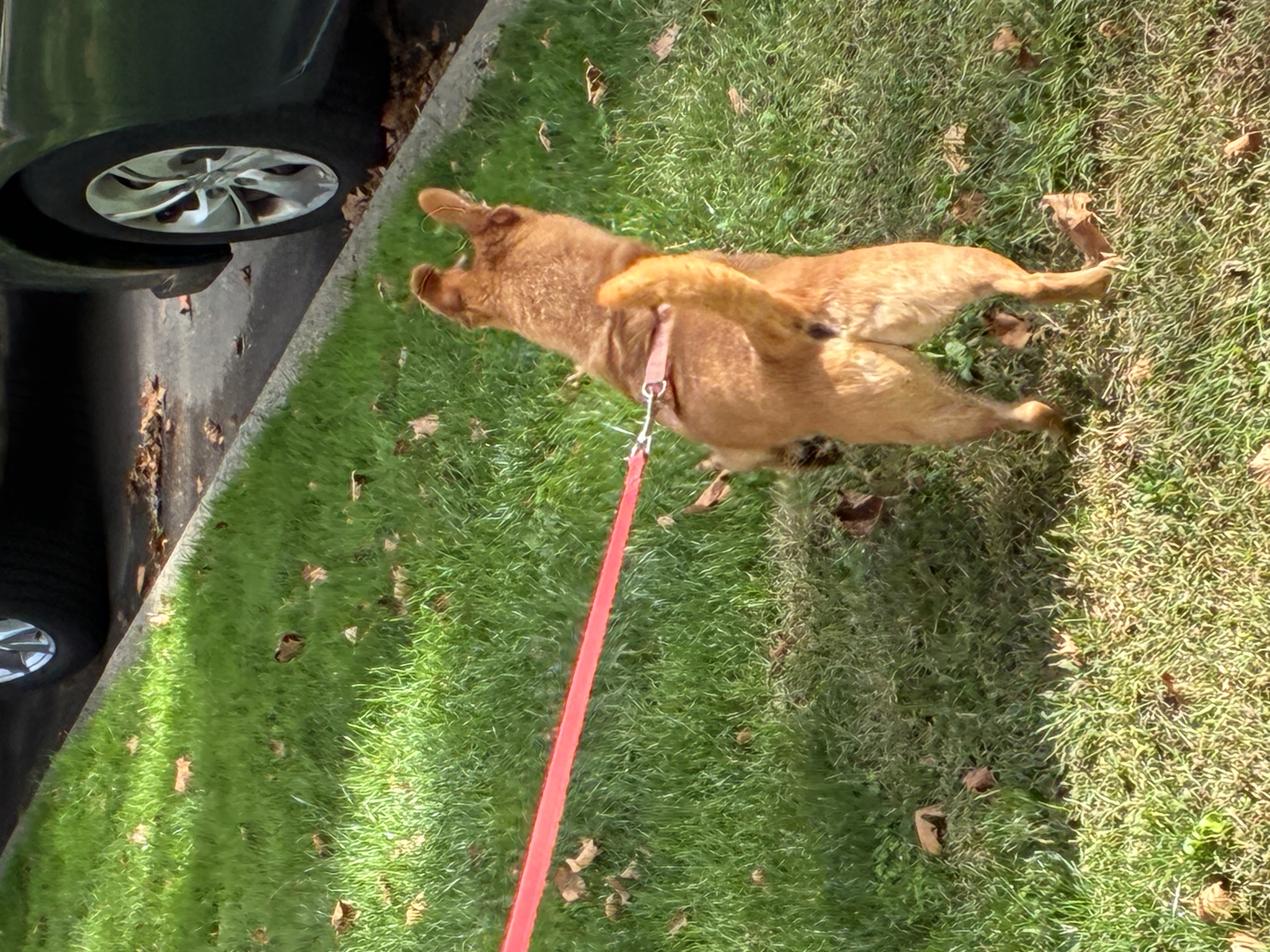 每次散步,她都一定要走在前面,尾巴翹得高高的,女兒告訴我,這表示她要做老大。我感覺她除了要做老大,她也想在前面保護我們,因為每次有陌生人靠近,她都會衝上去,警告他們離開;有汽車飛快地經過時,她也會大喊大叫;她最痛恨那種黃色的校車,因為以前看姐姐們上學時,被這個怪物給吞了進去。有時候太太會突發奇想脫離遛狗隊伍,要看看街對面鄰居家的漂亮花草,Sammy也要快速衝到太太的前面去佔位,這就害慘了我,會被繩子拉着跑。