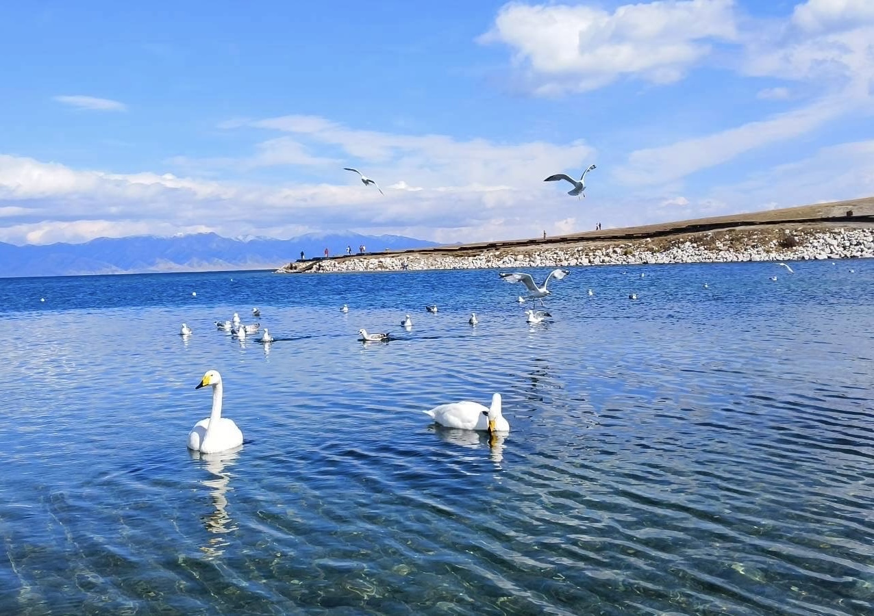 賽里木湖如寶石般湛藍,天鵝與海鷗悠然滑翔。