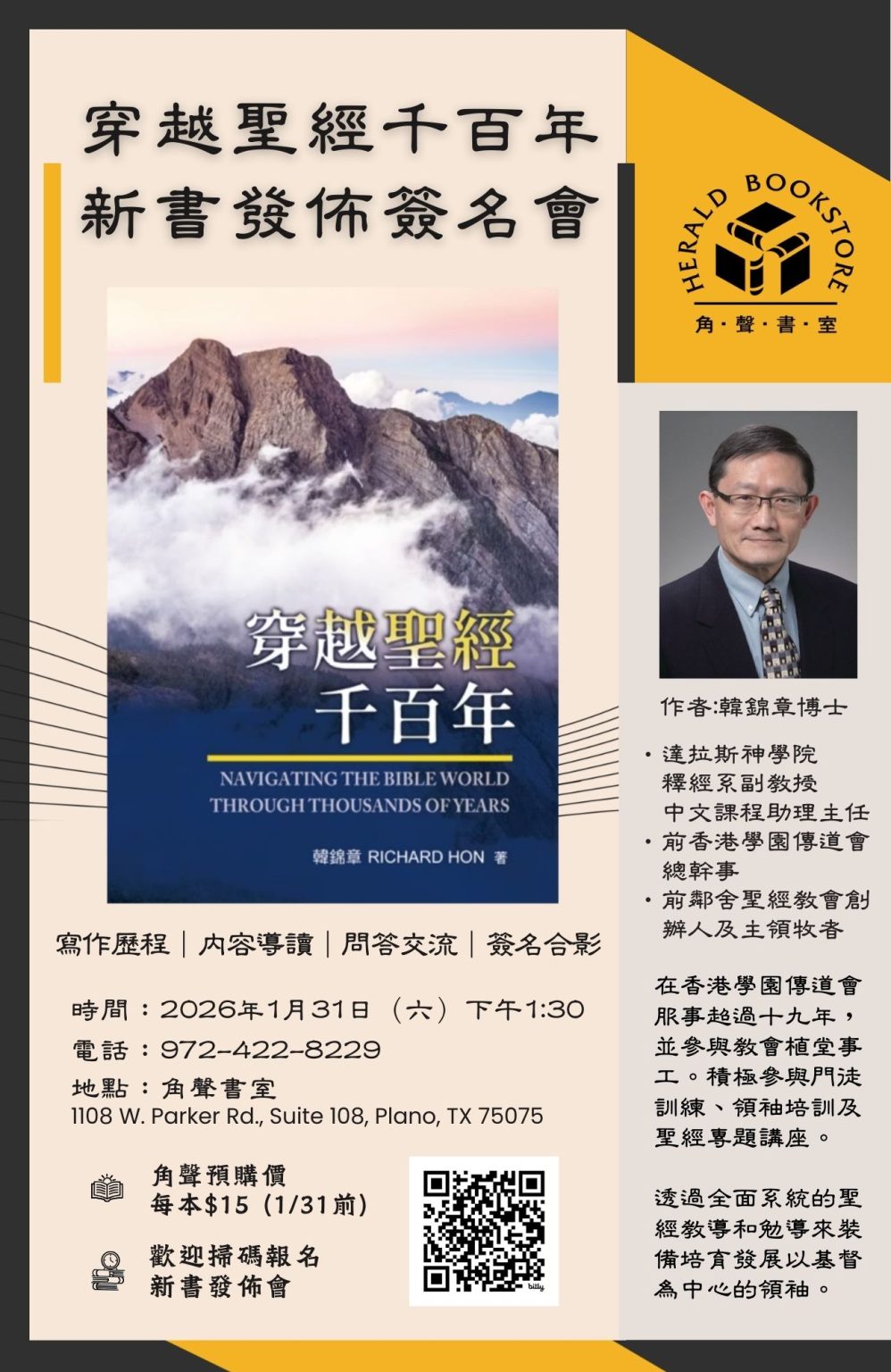 韓錦章老師新書發佈會1月31日,韓老師將舉辦新書發佈簽名會,介紹新書《穿越聖經千百年》,此書集結《聖經》故事,以宏觀敘事方式串聯歷史、文化與神學脈絡,幫助讀者回望上帝的救贖作為。(詳情請見第12版廣告)。