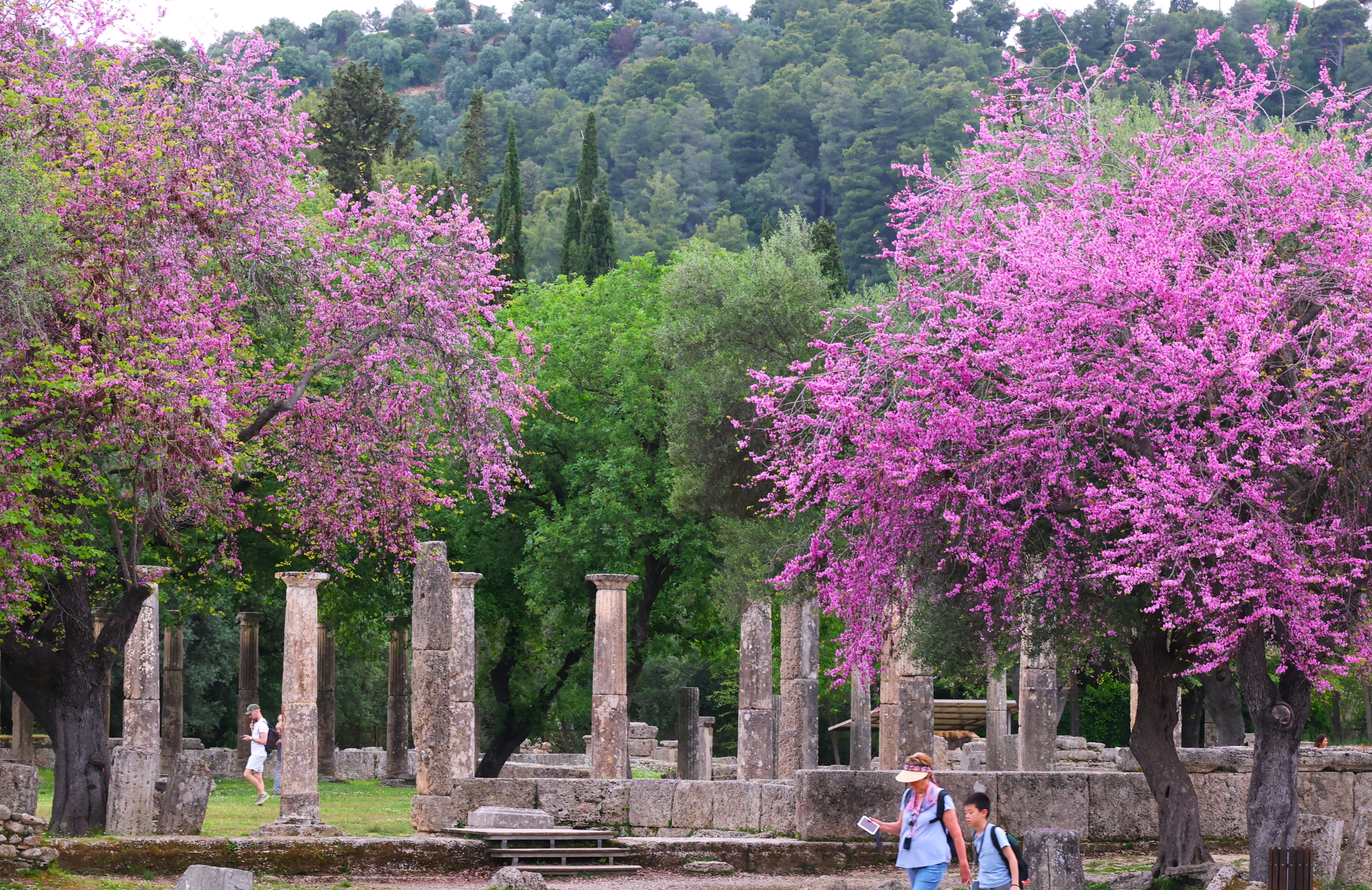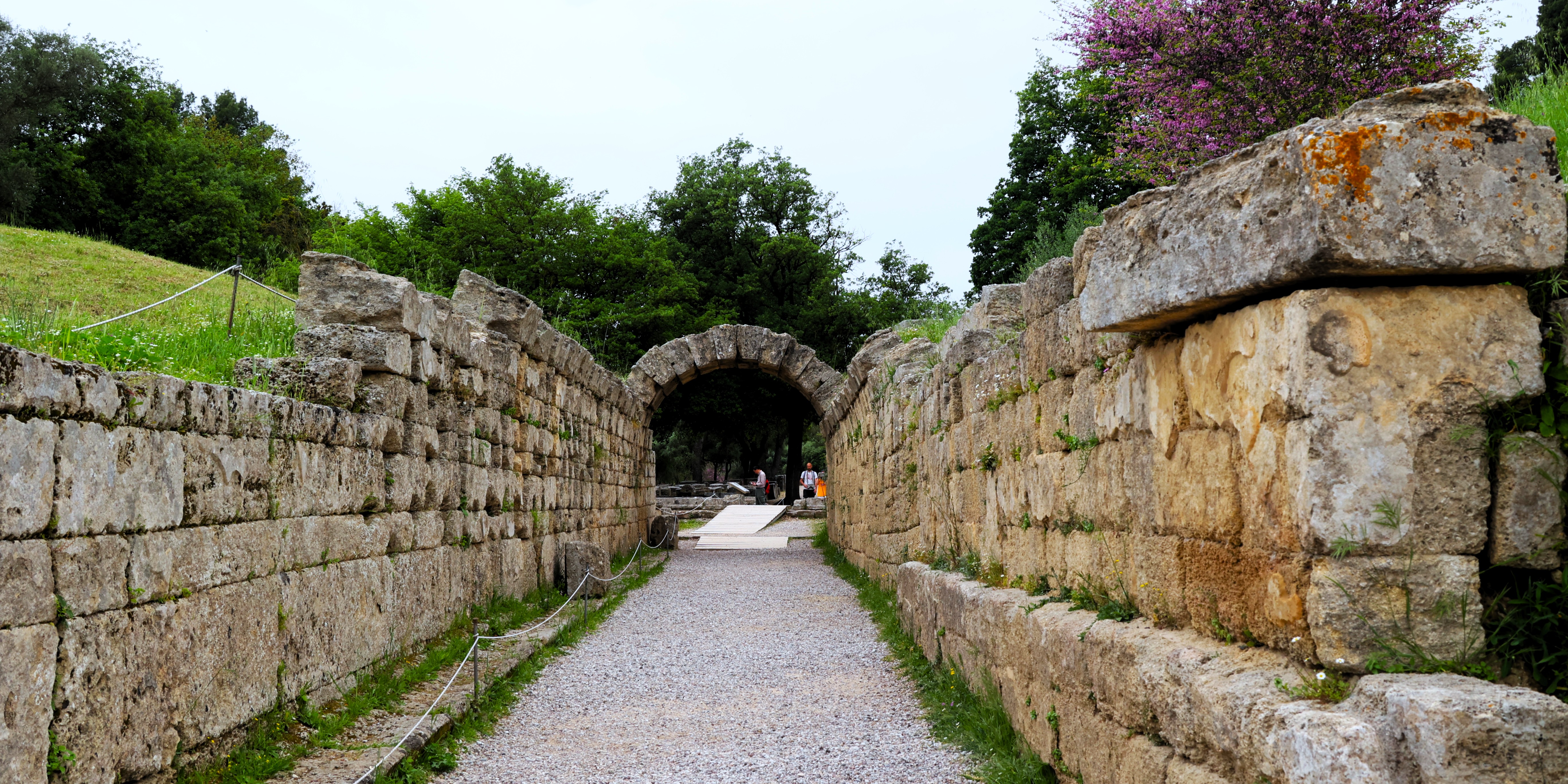 走進奧林匹亞考古遺址,眾多粗壯的多立克式石柱聳立在春天的綠樹和粉色的桃花中間。曾幾何時。它們是雄偉的宙斯神廟的廊柱和支柱;如今,歲月磨去了它們身上華麗的飾紋,裸露着像運動員身上肌腱般的紋理。順着用大石塊堆砌而成的拱門和通道,來到競技場(Stadium)。