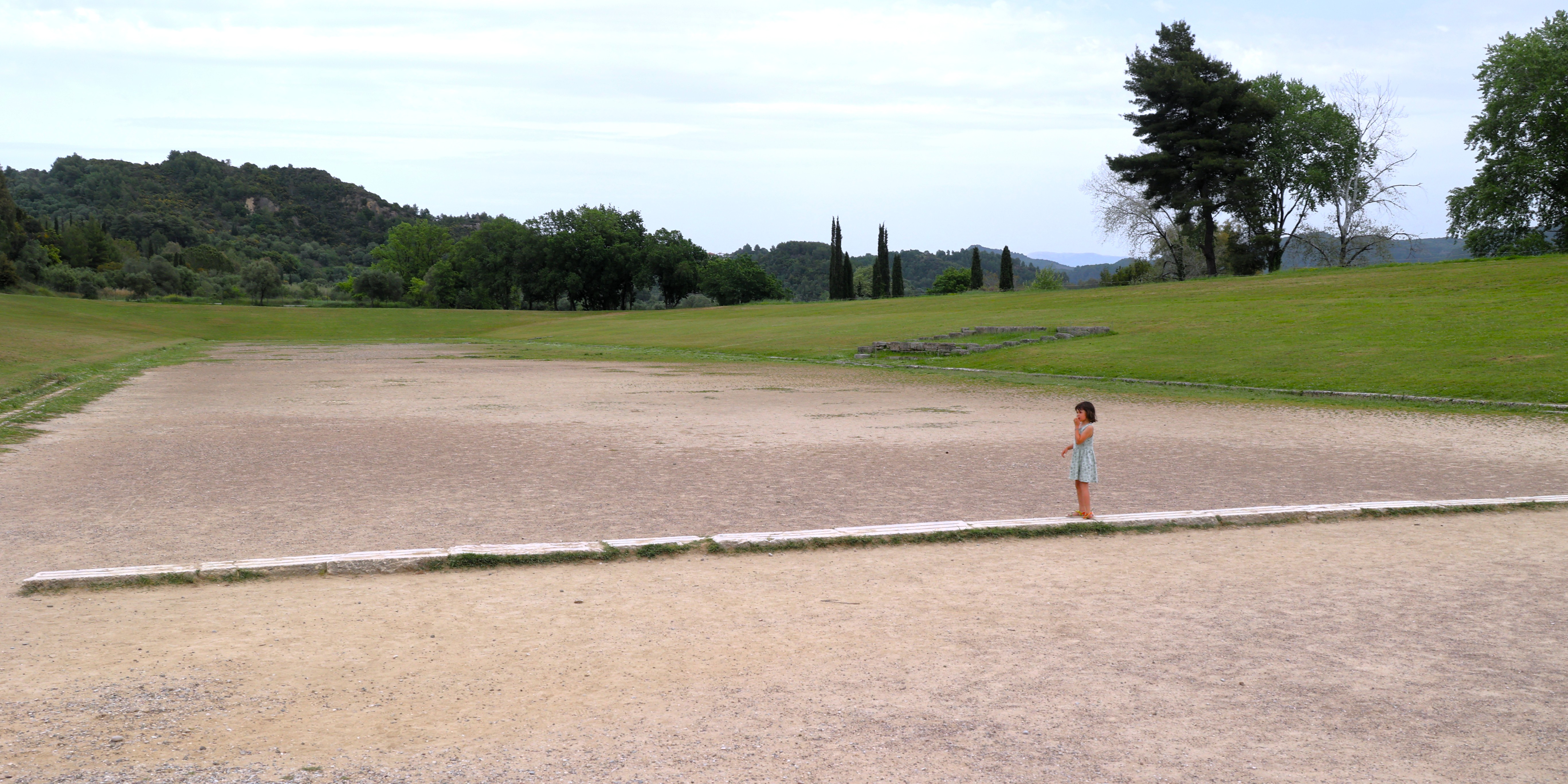 古奧運的跑道長約192.27米,(現代任何一所高中的田徑場都比它大。)場內還保存着起跑線,裁判席與坡地看台。據說這裡可容納四萬觀眾。我看到一位年輕的父親抱着幼小的女孩,與另一個小女孩在古跑道上奔跑。興致勃勃的遊客們都喜歡在這裡體驗一下古希臘人競賽的感覺。