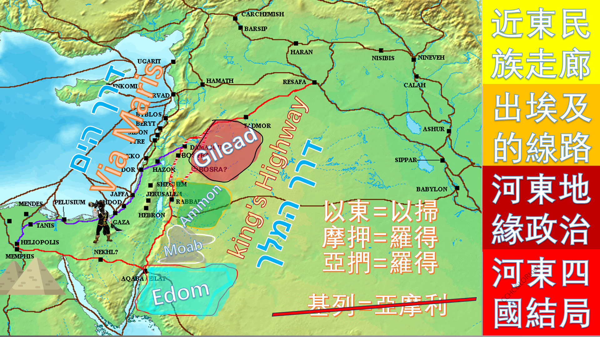當以色列人終於準備好進入迦南地時,他們必須先沿王道北上,經過約旦河東岸的四個國家:最北的基列(Gilead),再往南是亞捫(Ammon)、摩押(Moab),最南是以東(Edom)。