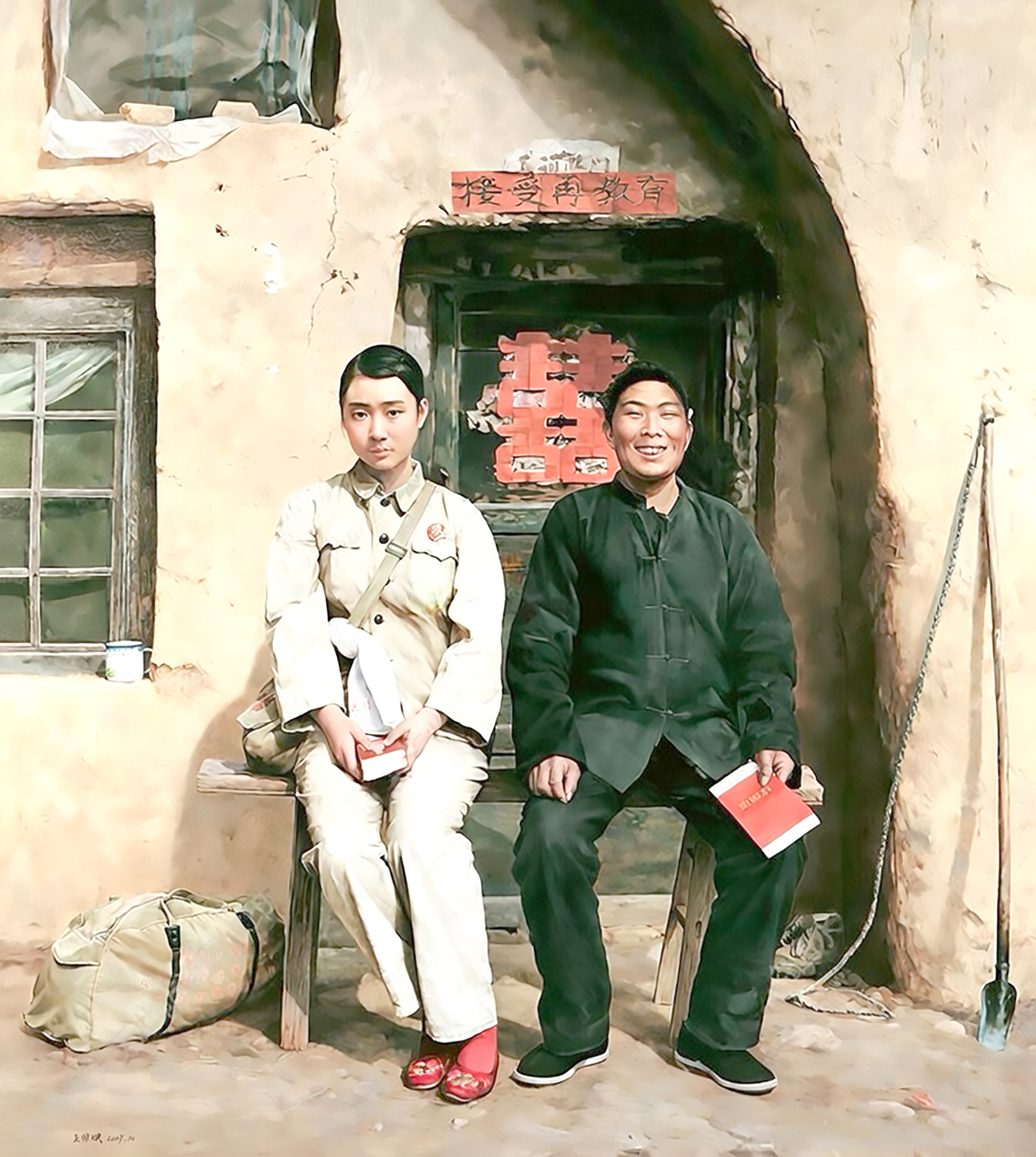 《我的前夫》是一幅關於中國文革期間知青婚姻的油畫作品,作者王國斌是一位知青畫家。畫面中的夫妻極不相稱地坐在一起,農民新郎的喜氣洋洋與知青新娘的憂傷絕望形成鮮明對比。在那個非常時期,個人命運只能接受國家政策的任意擺佈,很多回城絕望的女知青無奈之下只好嫁給當地農民。及至文革結束時,很多女知青又通過招工或升學回到城市,也有很多人就在下鄉的農村永遠生活下去。這幅畫中的新郎,後來不幸成為了「我的前夫」,但新娘即便已經回城,也不可能完全擺脫前半生的影響。據說在展廳,很多老知青泣不成聲,這是個人的悲劇,更是時代的悲劇。