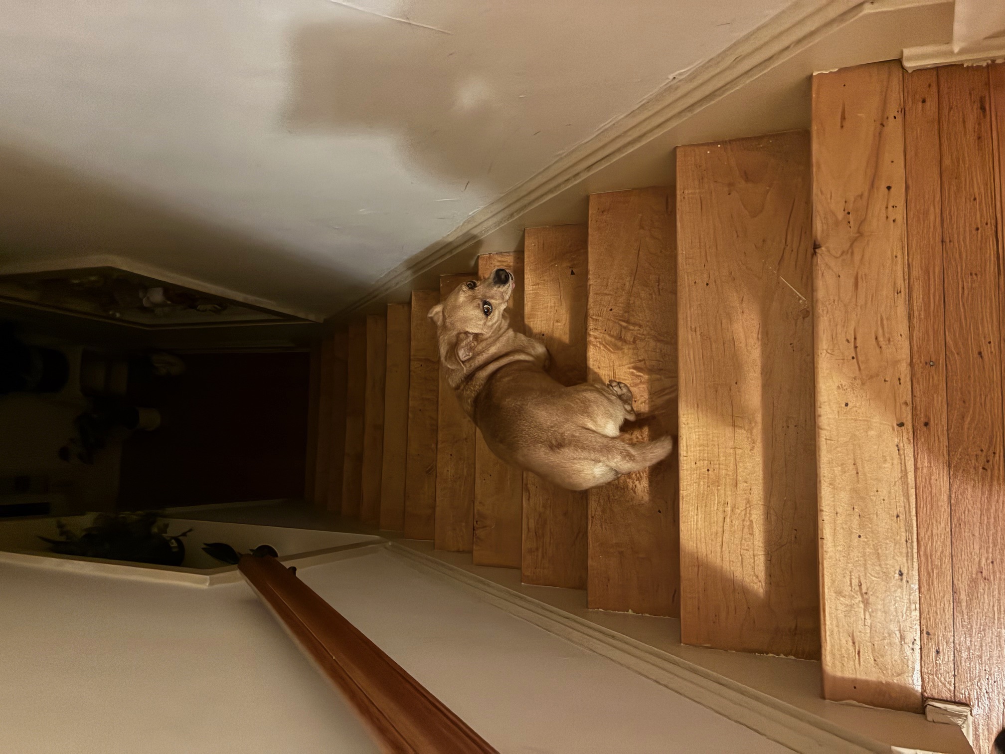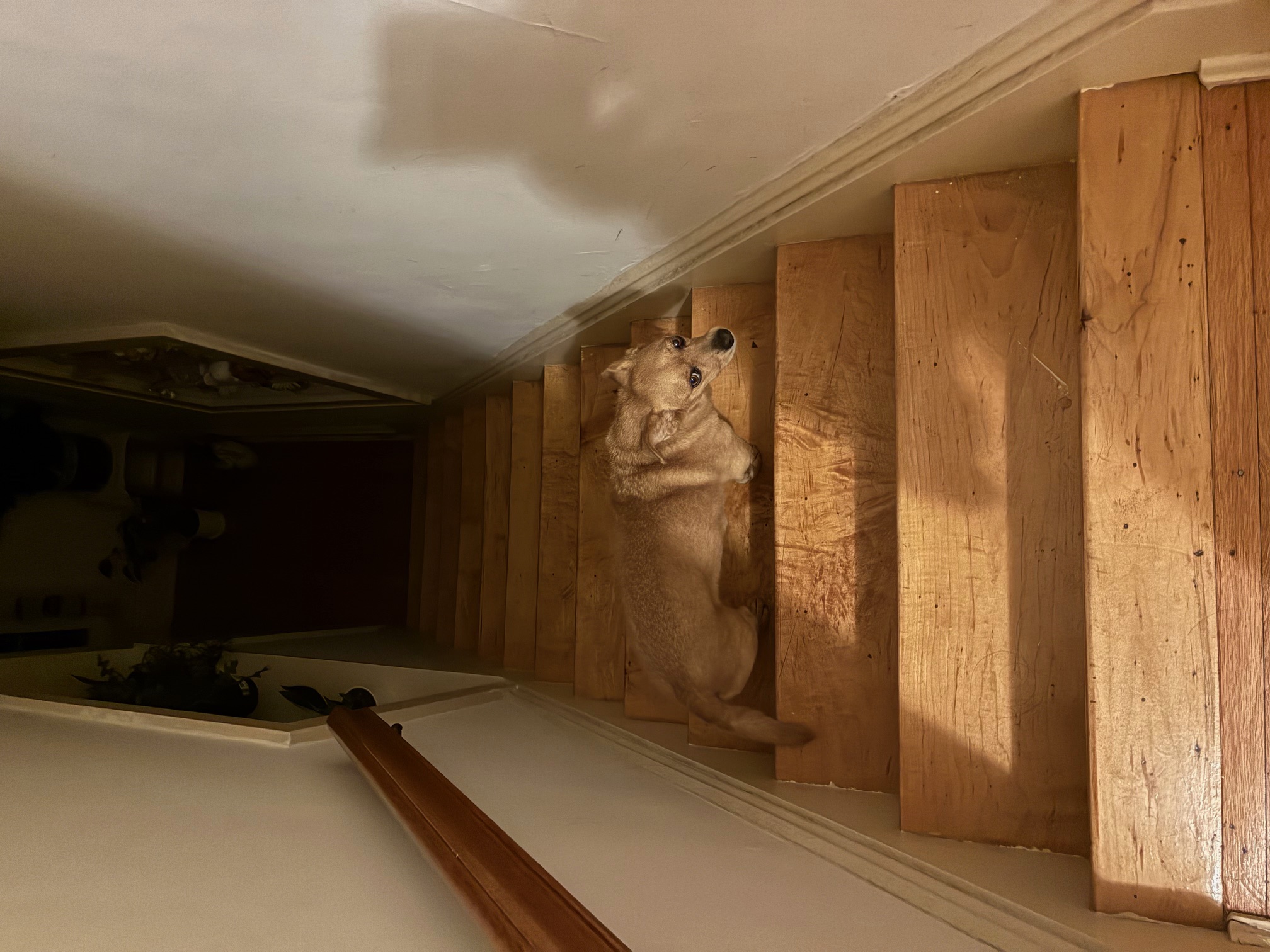 兩分鐘長考要不要下樓有一天陪她起夜,不小心在樓梯上滑倒了,從二樓滑到了一樓,痛得我坐在地上起不來。第二天去看急診,以為是骨折了,還好只是肌肉拉傷。Sammy明白是她闖了禍,一直圍着我轉;當看到我要艱難地下樓時,她會搶在我前面下去,然後等在樓梯口,一臉緊張地看着我下樓。女兒說:「這是Sammy在關心你,怕你再摔跤。」我說:「我也這樣認為,但是也可能她想再看我摔一次,那天晚上沒有看清楚。」女兒聽了哈哈大笑。