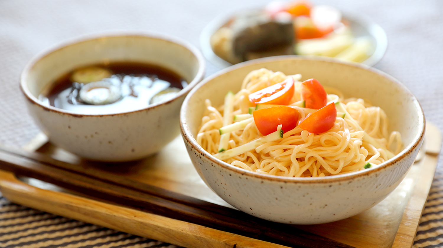 記憶猶新的是,一邊心懷犯了家規的愧疚,一邊又飢渴地等待着父親或哥哥從離家15分鐘遠的飲食店買回來的焦灼心情。感覺時間過得特別慢,怎麼還沒來,還沒來。然後,就見他們端着那隻扁扁的有點變形的鋼熜鑊子(鋁鍋),裝着一鍋冷麵,有時四兩,盛滿時有六兩。那時不講究澆頭,光是麵,店家用醬油、醋、花生芝麻醬做拌料,聞着特別香。天色已經暗下來,一家人圍坐在門外,邊乘風涼,邊吃冷麵。麵條一根根清爽不粘連,還有嚼勁,我們兄妹仨是主力,狼吞虎嚥,一下子就鍋底朝天了。一碗冷麵下肚,白日的炎熱難耐,和我對洋西米的煩惱,便如薄霧般散開了,心滿意足。