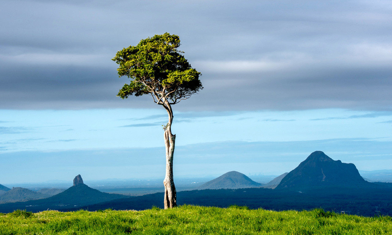 不過,在參觀完玻璃屋山之後,自駕遊的朋友,建議你們不要按地圖指引,直接進入瑪蕾麗鎮,而要在中途轉入山景公路(Mountain View Road)。因為這條公路上,不僅沿途都有宜人景色,更藏有一處,據稱是陽光海岸地區「打卡」率最高的旅遊景點。這就是座落在整條公路大概中間位置,一片開闊地上的那棵「孤獨的樹(One Tree Hill)」,相襯的背景則是宏偉而遼闊的玻璃山脈全景。