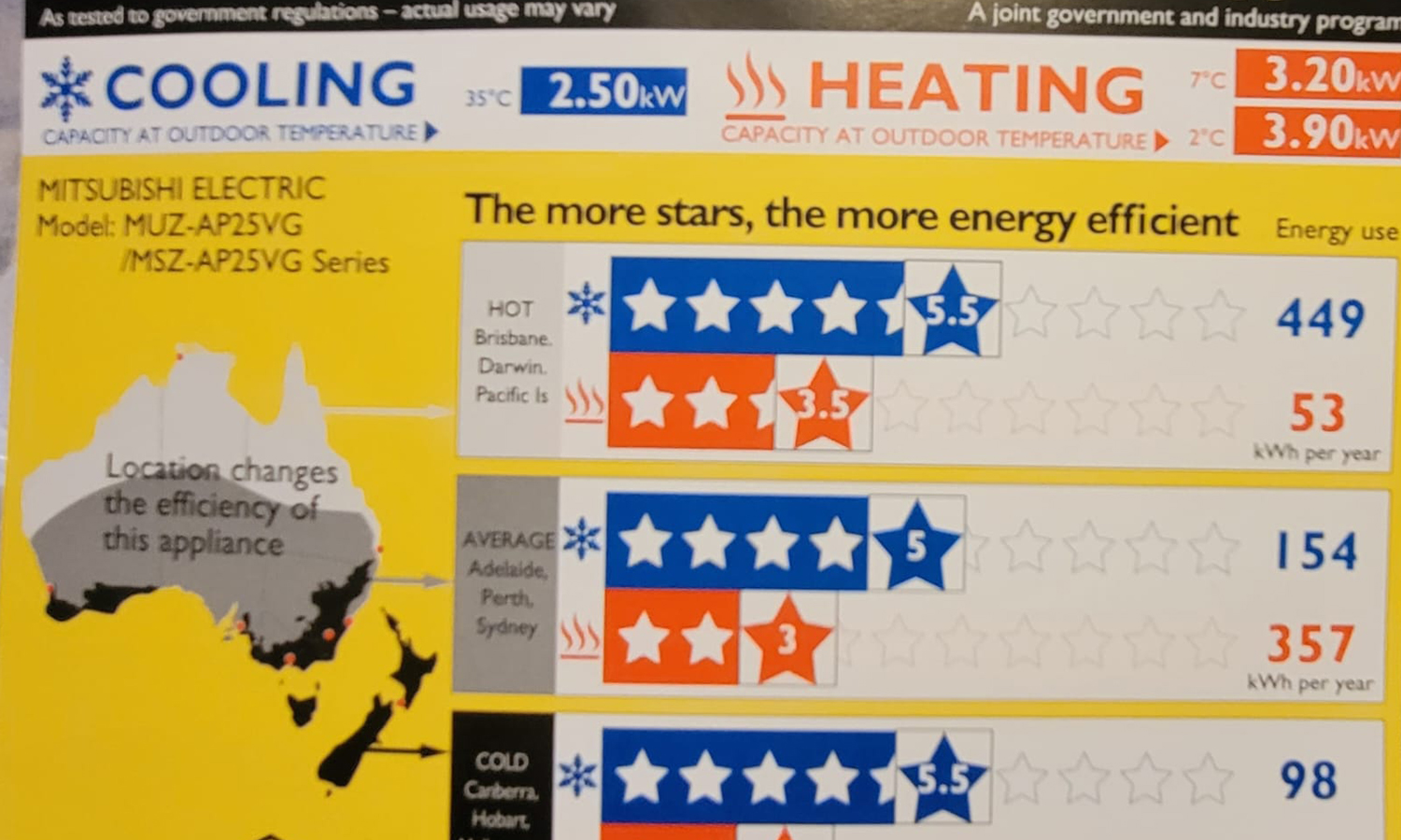在墨爾本生活,使用暖氣的日子長,需要開啟冷氣的日子很少。因此,選購冷暖空調機時,不要看能源標籤上有多少粒星,要看COP值,最好有4.6或以上,COP值越高,節省能源費越多。在墨爾本區域,三星能源標籤,COP值有4.78(見圖表)。