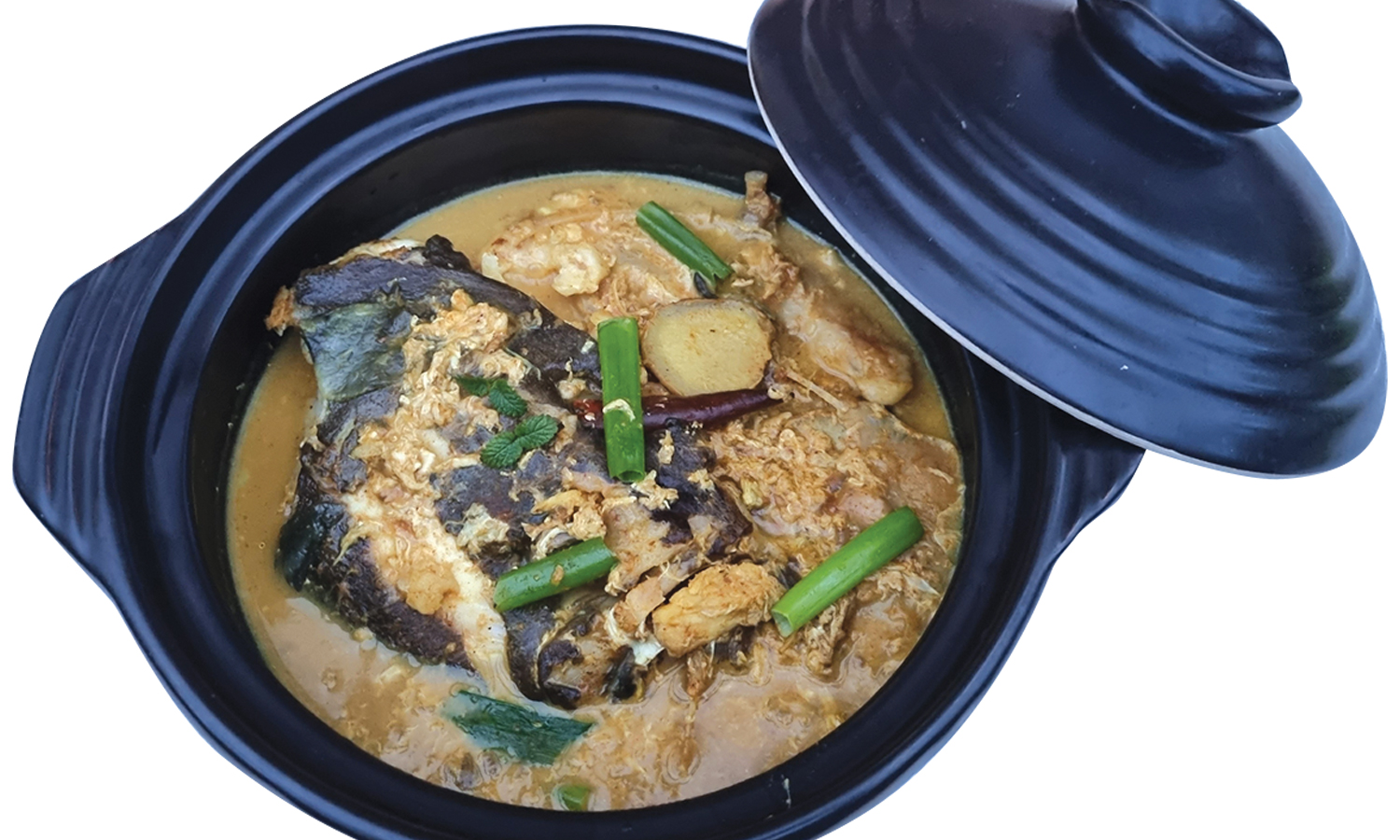 2. 鑊內放入油,將薑、葱略煎,加入大魚頭煎香兩面後放置一旁,放入咖喱粉、黃薑粉、辣椒及調味料煮沸至魚頭全熟收汁