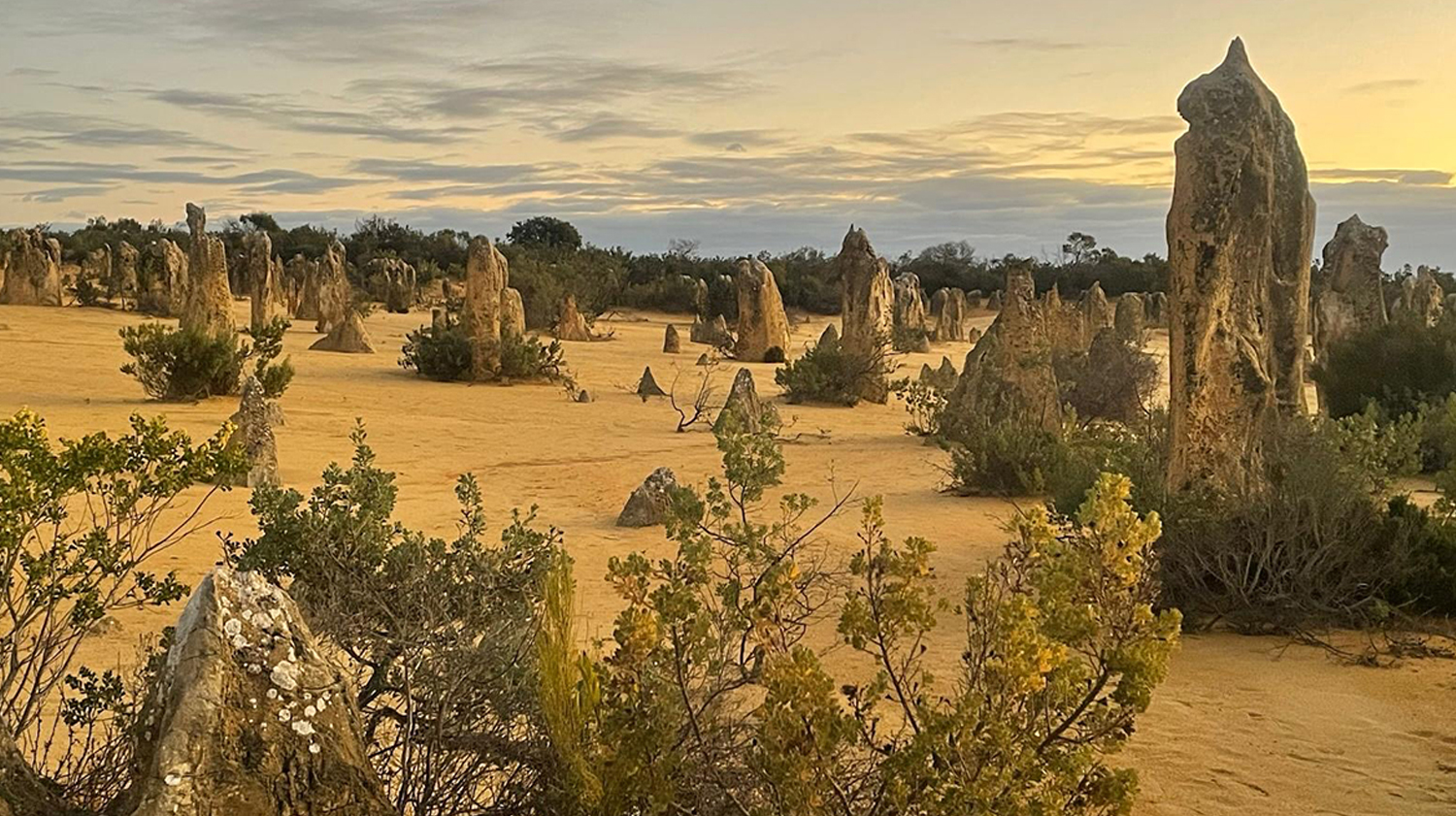 隨後前往著名的尖峰石陣(Pinnacle Desert)欣賞日落。奇形怪石令人嘆為觀止,與夕陽相映成趣,構成一幅難得一見的美景。若不是天色漸暗,大家都還捨不得離開。當晚住宿於Jurien Bay。