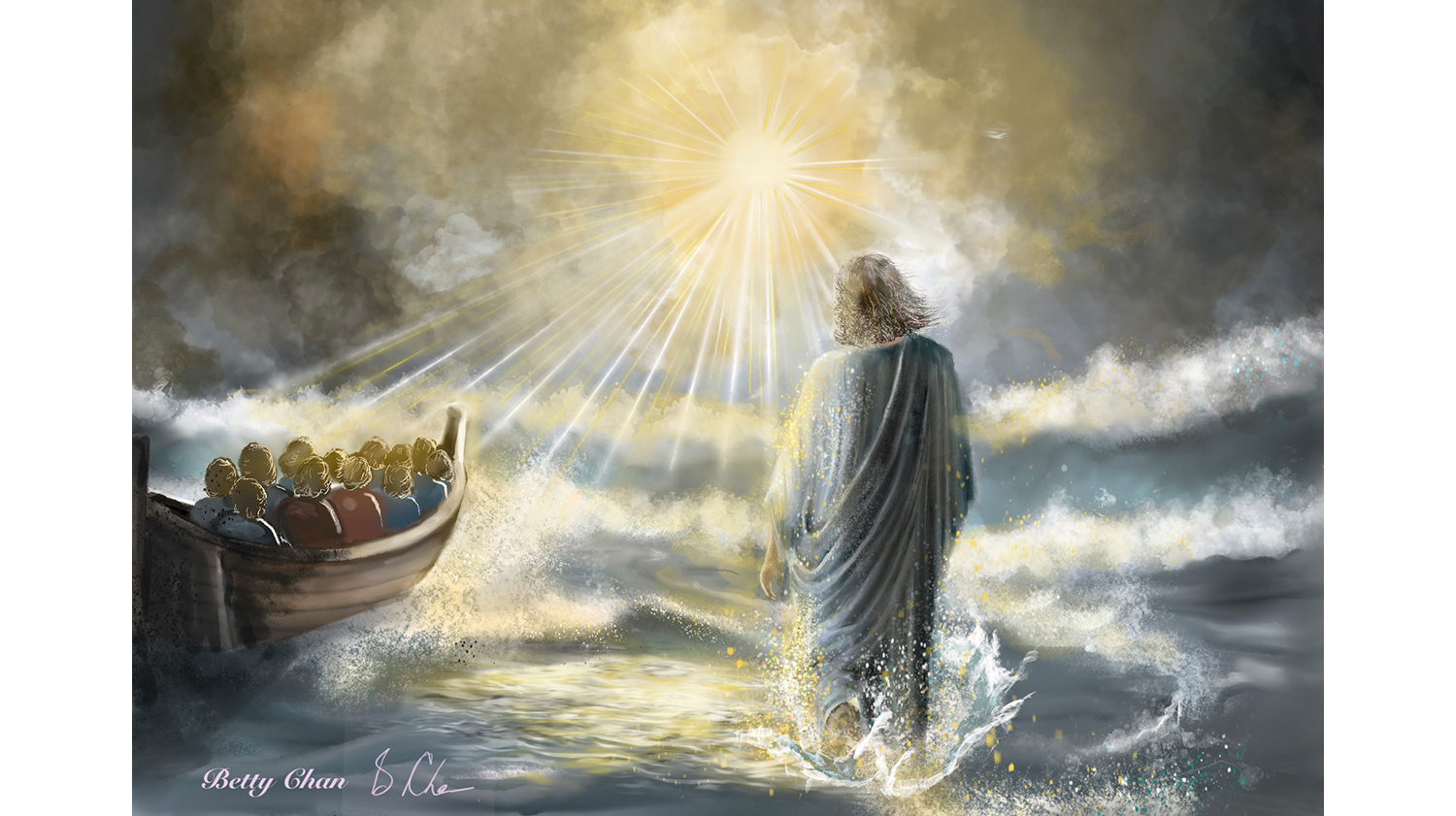 <div>耶穌隨即催門徒上船,先渡到那邊伯賽大去,等他叫眾人散開。他既辭別了他們,就往山上去禱告。到了晚上,船在海中,耶穌獨自在岸上;看見門徒因風不順,搖櫓甚苦。夜裡約有四更天,就在海面上走,往他們那裡去,意思要走過他們去。但門徒看見他在海面上走,以為是鬼怪,就喊叫起來;因為他們都看見了他,且甚驚慌。耶穌連忙對他們說:「<strong>你們放心!是我,不要怕!</strong>」於是到他們那裡,上了船,風就住了;他們心裡十分驚奇。這是因為他們不明白那分餅的事,心裡還是愚頑。</div>