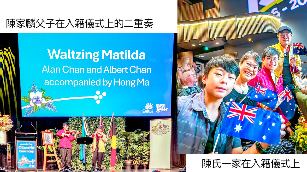 隨着陣陣掌聲響起,入籍儀式的一個特別節目,也被三位滿面春風的華人帶上了舞台。背景巨大的螢幕上寫着節目內容和演員名單:《Waltzing Matilda(叢林流浪)》,演奏者為陳家麟和陳安博父子(Alan Chan and Albert Chan),鋼琴伴奏馬泓。