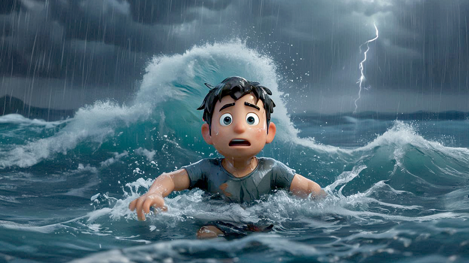 沒想天有不測風雲。忽然,海面上颳起風來,海浪也隨着狂風,掀起波濤。風助海勢,層層疊疊的浪湧,硬生生將小艇往大海深處推。母子奮力劃槳,但無濟於事,人在大自然面前的渺小與軟弱,此時更顯無助和絕望。
