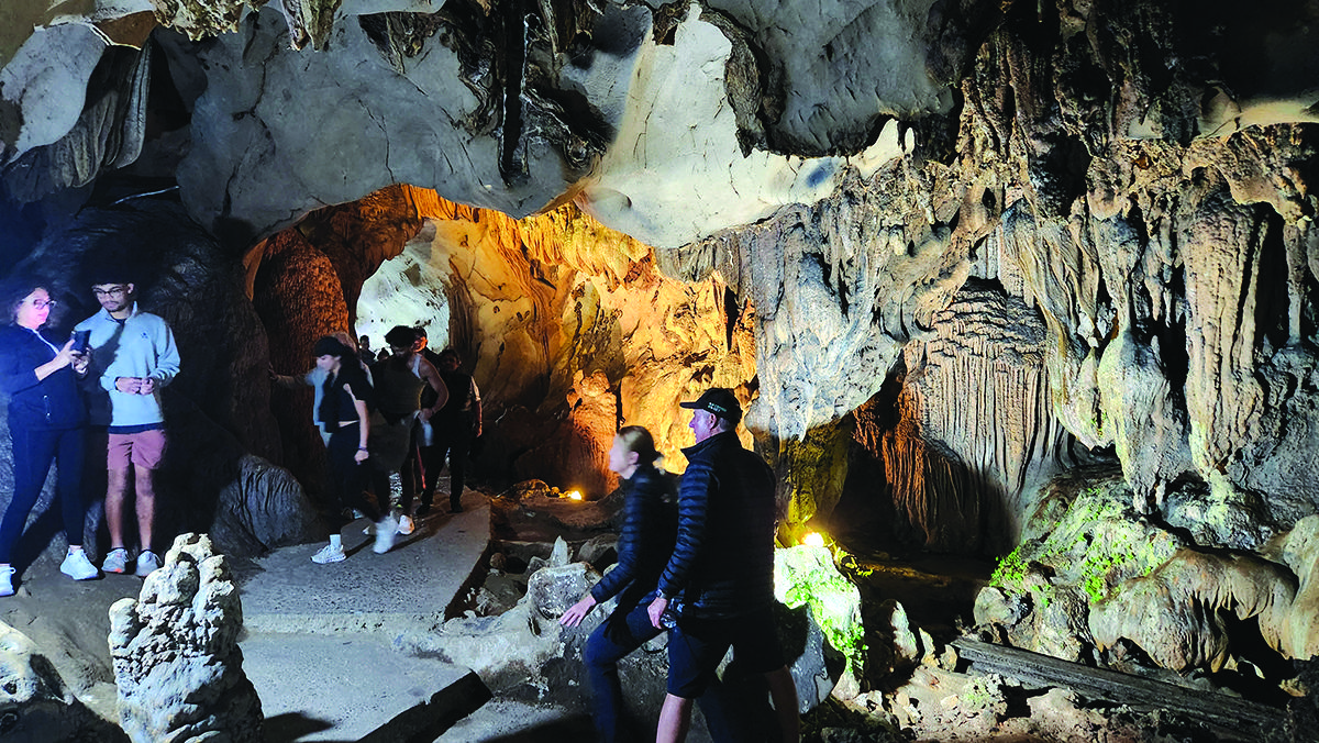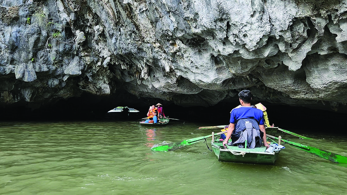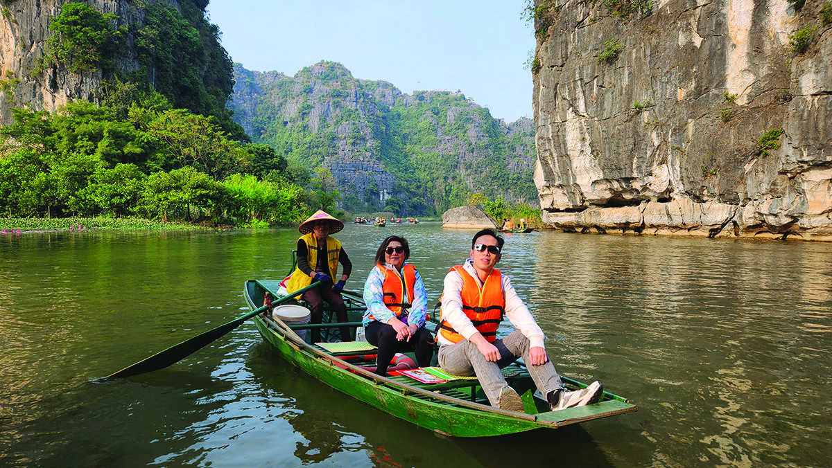 接着 乘坐木筏遊三谷,這裡的水道蜿蜒曲折,如同進入天然的水上秘境。船隨水流緩緩前行,兩側巍峨的石灰岩山巒倒映水面,祖母在靜靜欣賞這片 寧靜美景,父母與孩子則感受探索的樂趣。然而最令人驚喜的是當地的船夫,他們不僅能熟練地操作木筏,竟然還能用雙腳划槳!只見船夫靈活 地將腳掌抵住槳柄,優雅地滑動水面,船隻便穩穩地前行。這神乎奇技充分展現了越南人的靈活與智慧。坐在竹筏上,不僅能欣賞湖光山色,更 能從水道進人石山下的天然通道,驚嘆大自然的神工。最後,導遊帶我們到古都皇城內三谷碧峒旁的泰越寺。三代人同遊古剎,欣賞其建築的細 緻並儀式的莊嚴,更能留下珍貴的合影與回憶。