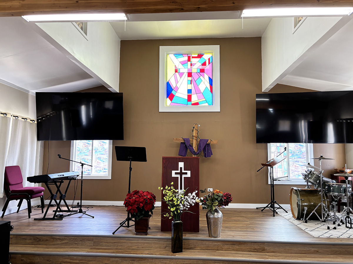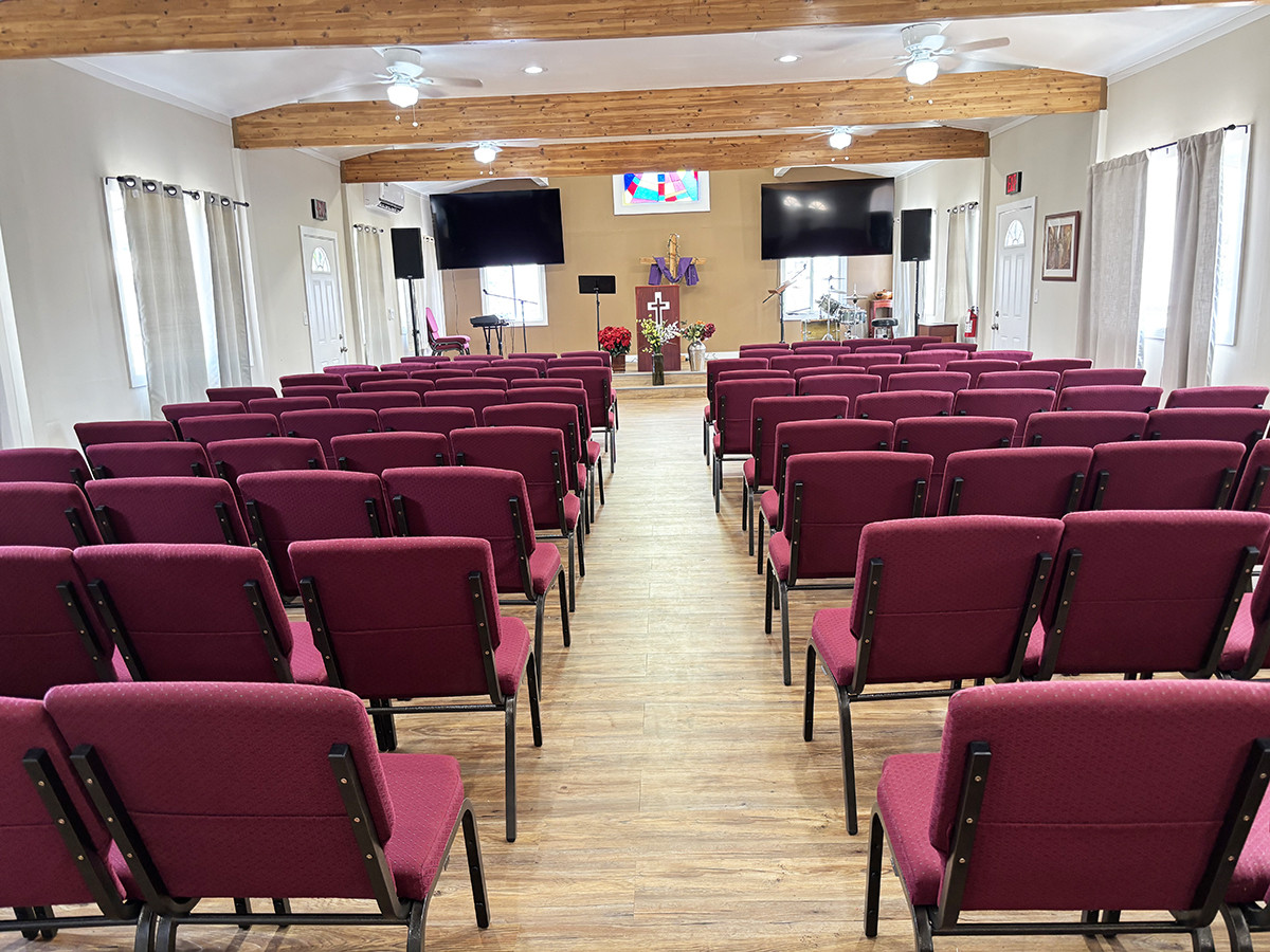 我們探訪的那天,羅傳道因事不在,他的師母及女兒,熱情地接待我們。那是一座白色的小教堂,裡面的裝置,簡約而溫馨。大堂有一百多張棗紅色的座椅,整整齊齊地擺放兩旁。中間一條通道,從大門直達講壇,講壇上有鮮花和十字架,表明這是敬拜三位一體真神的堂會。