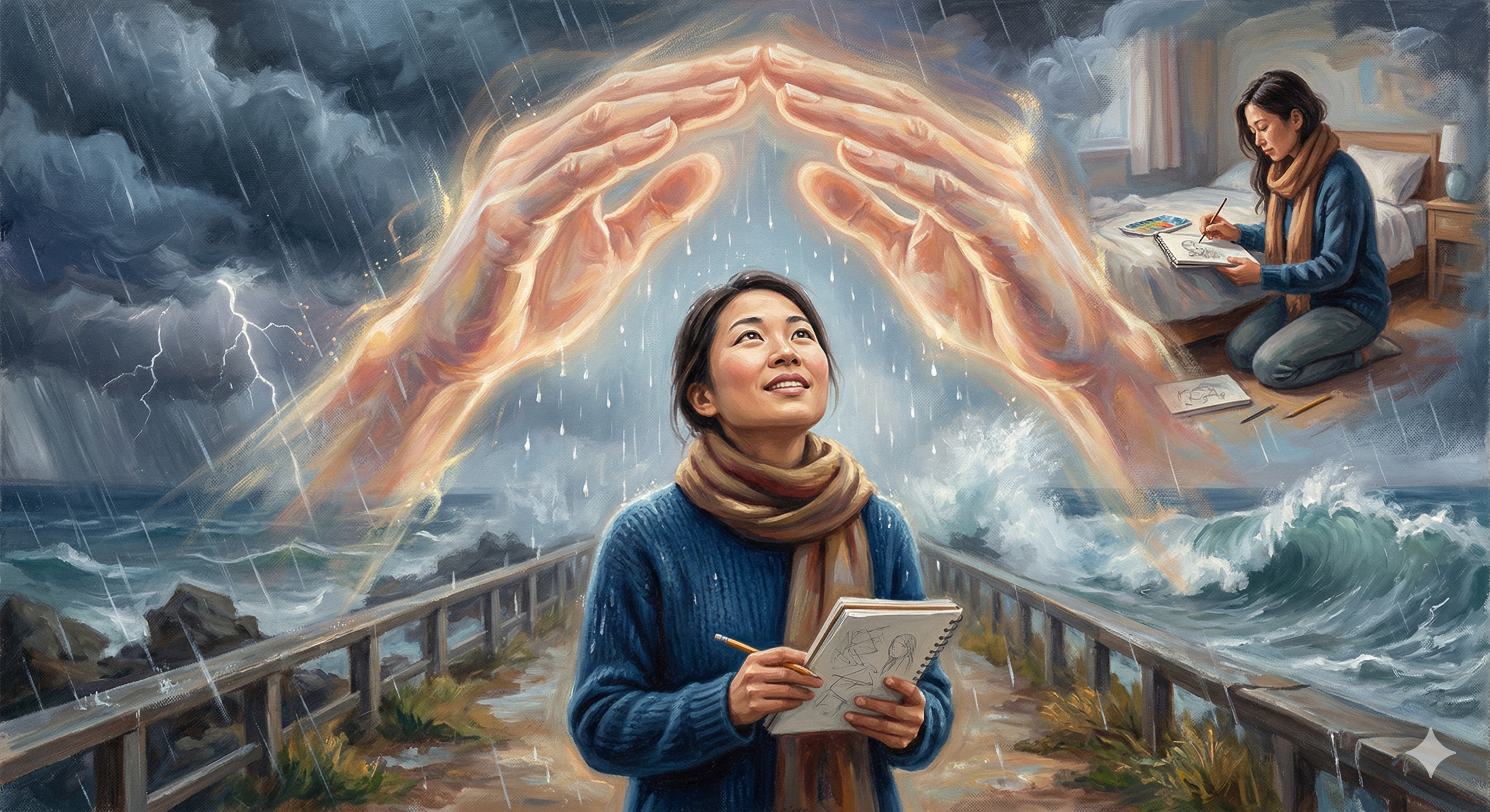 這幅畫所想表達的是:當我們以為自己正身處巨大的困難與試煉中,感到驚恐、孤單、沒有人明白時,其實灑下的只不過是幾滴雨而已;而那一雙大手——天父的手早已為我們擋住了真正的狂風巨浪、閃電雷鳴。彷彿天父在對我說:「我知道你能承受的限度有多少。我在這裡,你不要怕。」