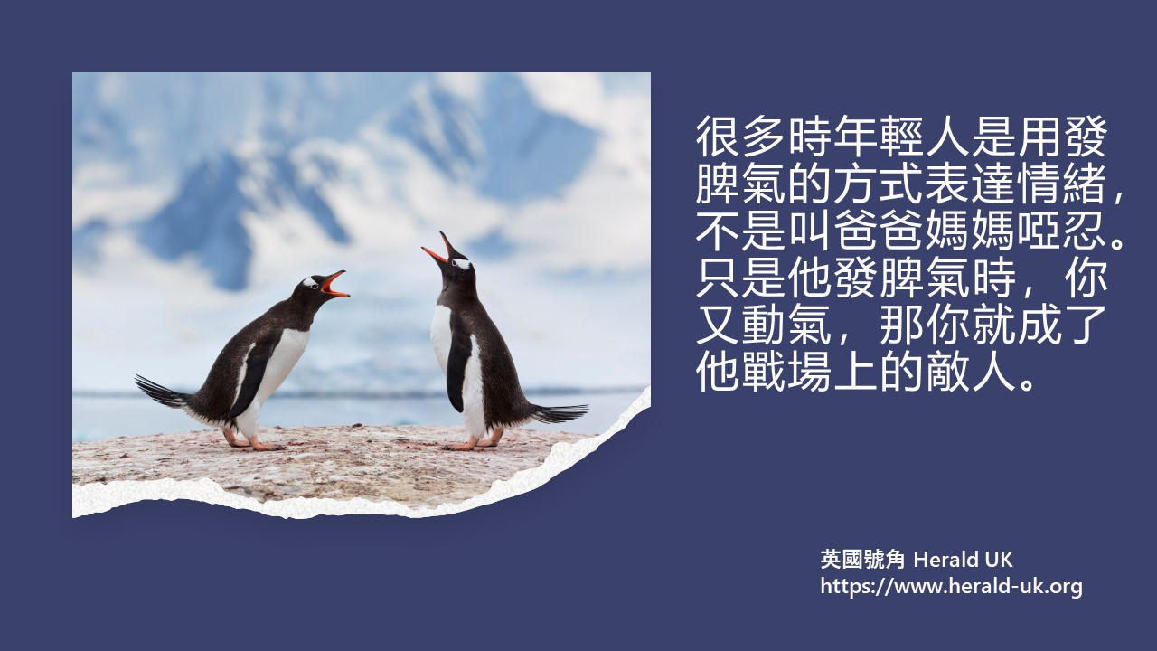 「忍耐」:很多時年輕人是用發脾氣的方式表達情緒,不是叫爸爸媽媽啞忍。只是他發脾氣時,你又動氣,那你就成了他戰場上的敵人。讓孩子先冷靜下來,再告訴他你想知道發脾氣背後的原因,你才會有機會被他邀請成為他的隊友。