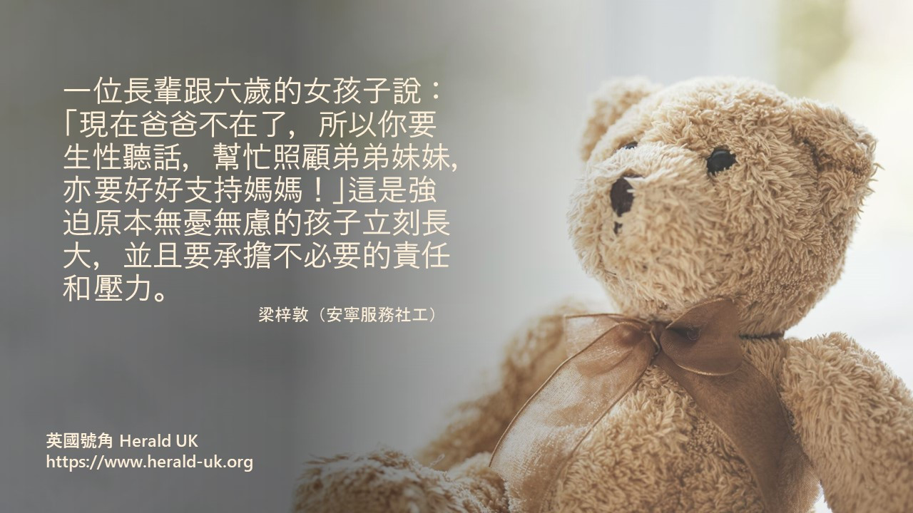 - 不將壓力放在孩子身上:一位長輩跟六歲的女孩子說:「現在爸爸不在了,所以你要生性聽話,幫忙照顧弟弟妹妹,亦要好好支持媽媽!」這是強迫原本無憂無慮的孩子立刻長大,並且要承擔不必要的責任和壓力。孩子需要成年人保護才能健康成長,尤其是經歷父母離世已經面對極大情緒壓力,如果還添加額外責任和期望,小小心靈怎能承受?喪親兒童普遍比同年兒童成熟,但需時間和安全感才能好好成長,成年人盡力讓他們做回一位普通兒童便足夠了。