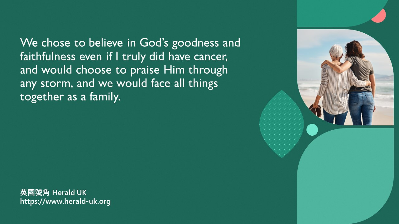 I spoke to my mum about these worries and she reassured me that she had spoken to my dad and they chose to believe in God’s goodness and faithfulness even if I truly did have cancer, and would choose to praise Him through any storm, and we would face all things together as a family. What giants of faith! Amen!