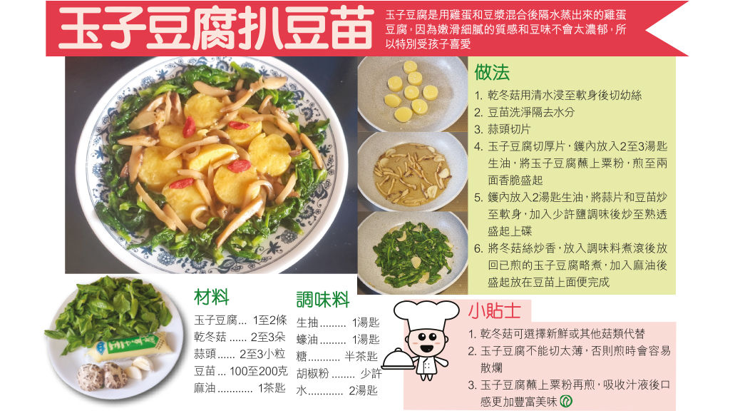 玉子豆腐 1至2條乾冬菇 2至3朵蒜頭 2至3小粒豆苗 100至200克麻油 1茶匙