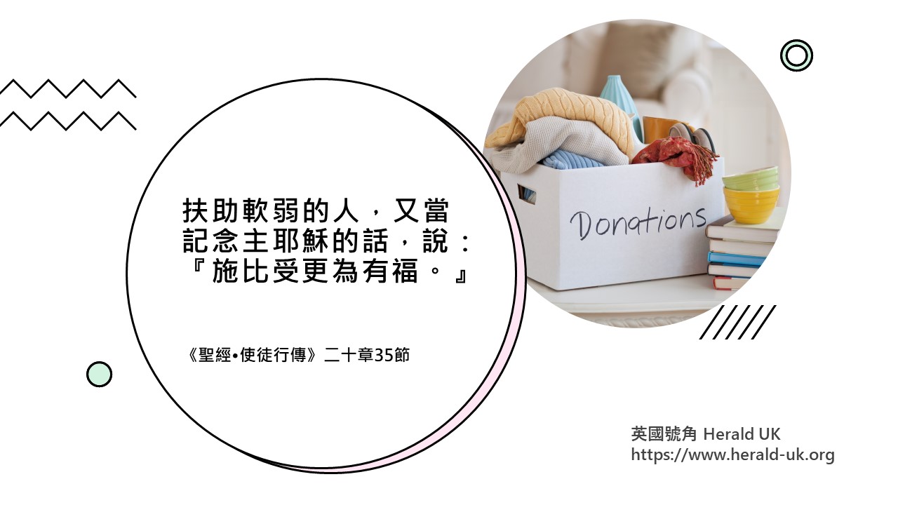 正如使徒保羅勸勉我們,要「扶助軟弱的人,又當記念主耶穌的話,說:『施比受更為有福。』」(《聖經•使徒行傳》二十章35節)能夠向慈善商店捐贈、購物或當義工,是一種祝福。既能節省,減少浪費及保護環境,亦能幫助有需要的人,何樂而不為呢?