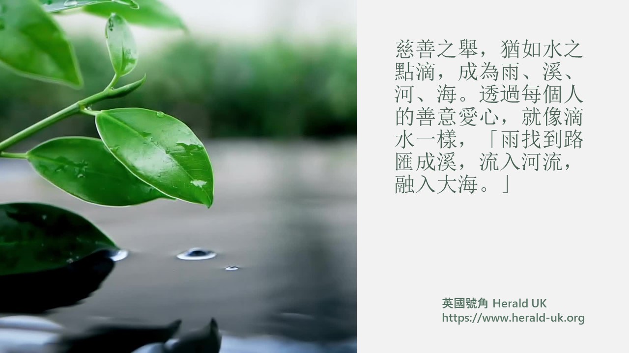慈善之舉,猶如水之點滴,成為雨、溪、河、海。透過每個人的善意愛心,就像滴水一樣,「雨找到路匯成溪,流入河流,融入大海。」那股澎湃浩大的力量,每個人都能參與投入其中、付諸行動,不自覺地就能融入在生活的細節中。這看似微薄的行動,卻能改變社區,甚至影響國家的前景。