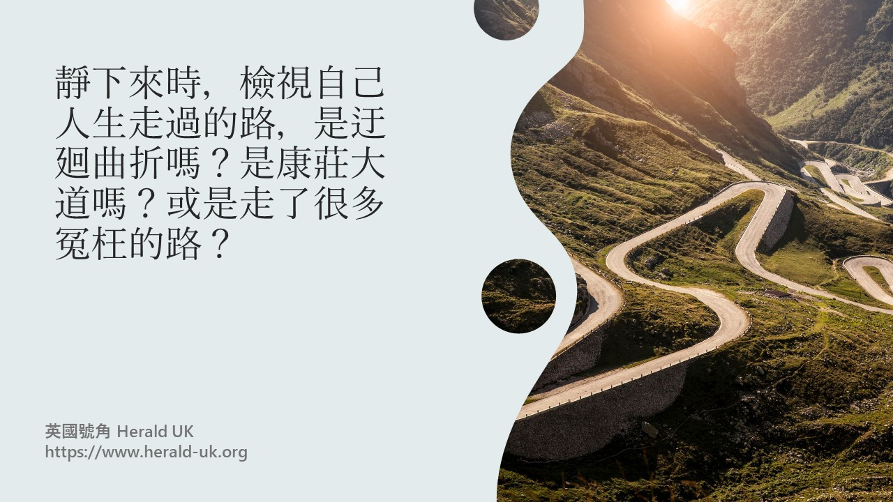 在人生的下半場,或者踏入退休的年齡,可以放慢脚步,瀏覽周邊的人物與風光。靜下來時,檢視自己人生走過的路,是迂廻曲折嗎?是康莊大道嗎?或是走了很多冤枉的路?當路途上遭遇苦難時,不知前面的路如何走下去,徬徨不知道怎辦,人如何面對?很多時人會感到悲痛、憤怒、哀傷,特別是患有惡疾,醫生診斷只剩有限光陰時,第一次體驗死亡正在臨近。那時人會反思,在世上還有什麼未完成的工作,有什麼渴望要見的人?
