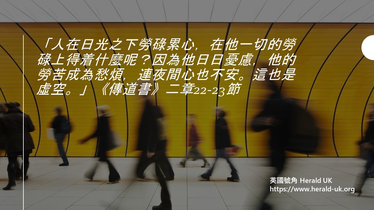 年幼時,父母鼓勵我們勤奮向學,考取好成績,希望長大後獲得高薪厚職。在職場、商場或官場拼搏、掙錢,追逐名利和舒適的生活,才有滿足感,自覺已達到人生目標,死而無憾。但《聖經》教導:「人在日光之下勞碌累心,在他一切的勞碌上得着什麼呢?因為他日日憂慮,他的勞苦成為愁煩,連夜間心也不安。這也是虛空。」(《傳道書》二章22-23節)