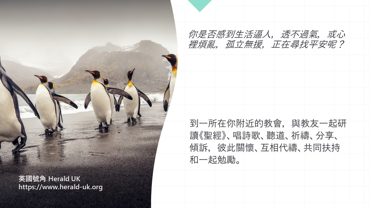 《英國號角》每期都載有教會名錄,列出英國各地的華人教會地址及聯絡資料。到一所在你附近的教會,與教友一起研讀《聖經》、唱詩歌、聽道、祈禱、分享、傾訴,彼此關懷、互相代禱、共同扶持和一起勉勵。人生觀、價值觀、性情及脾氣得到調整,心靈便會得到醫治。《聖經•腓立比書》四章7節說:「上帝所賜、出人意外的平安必在基督耶穌裡保守你們的心懷意念。」你是否感到生活逼人,透不過氣,或心裡煩亂,孤立無援,正在尋找這份平安呢?正如一首詩歌的歌詞說: