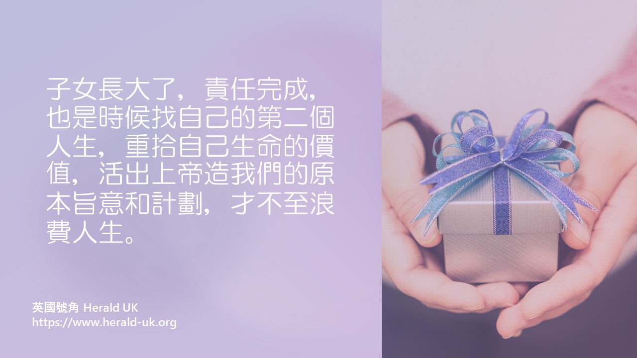子女長大了,責任完成,也是時候找自己的第二個人生,趁還未算老態龍鍾,仍能健步如飛,思考尚算靈敏,找點有意義又能讓自己的興趣或技能繼續發揮,不斷更新、不斷提升,閒來學學科技知識,跟上潮流,一直有去教會的,更能在退休後有更多時間可以幫忙教會的社區服務或社群活動,回歸群體生活,繼續貢獻自己,幫助別人,重拾自己生命的價值,活出上帝造我們的原本旨意和計劃,才不至浪費人生。