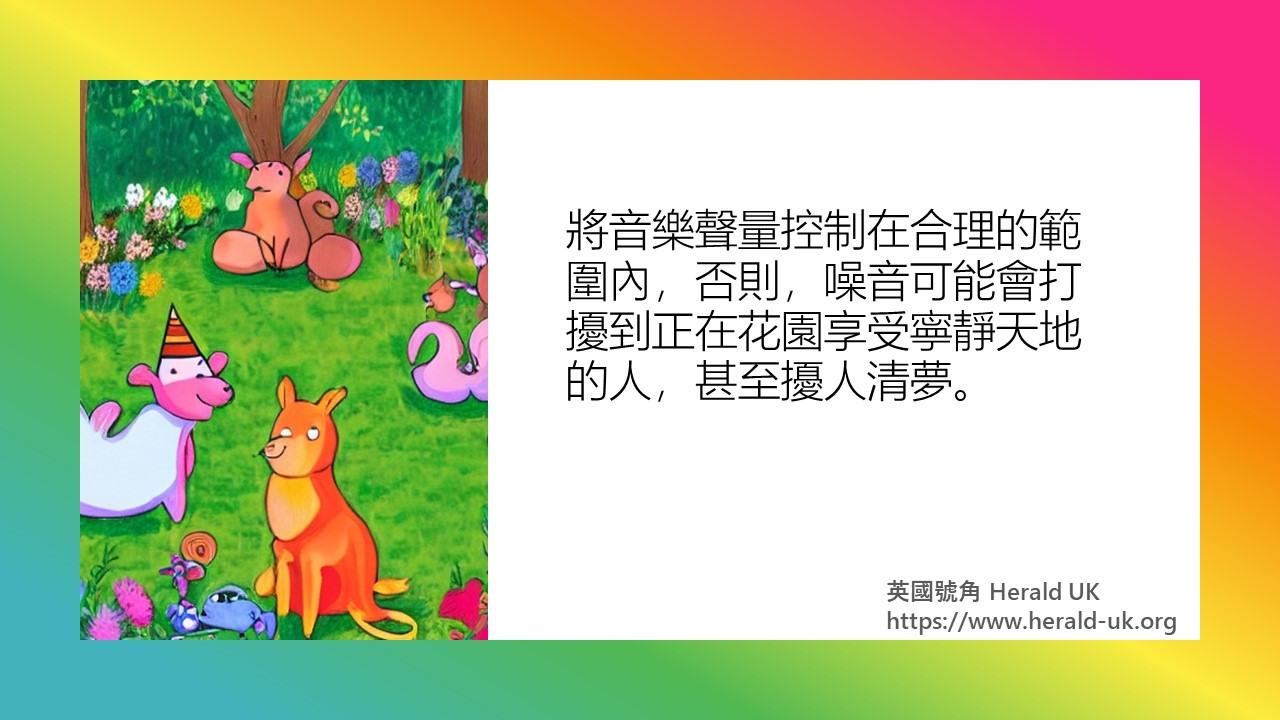 - 噪音控制。戶外聚會開心興奮是難免的,會有輕快的音樂和熱鬧的交談,但一定要注意控制噪音,尤其是在居民區。將音樂聲量控制在合理的範圍內,否則,噪音可能會打擾到正在花園享受寧靜天地的人,甚至擾人清夢。