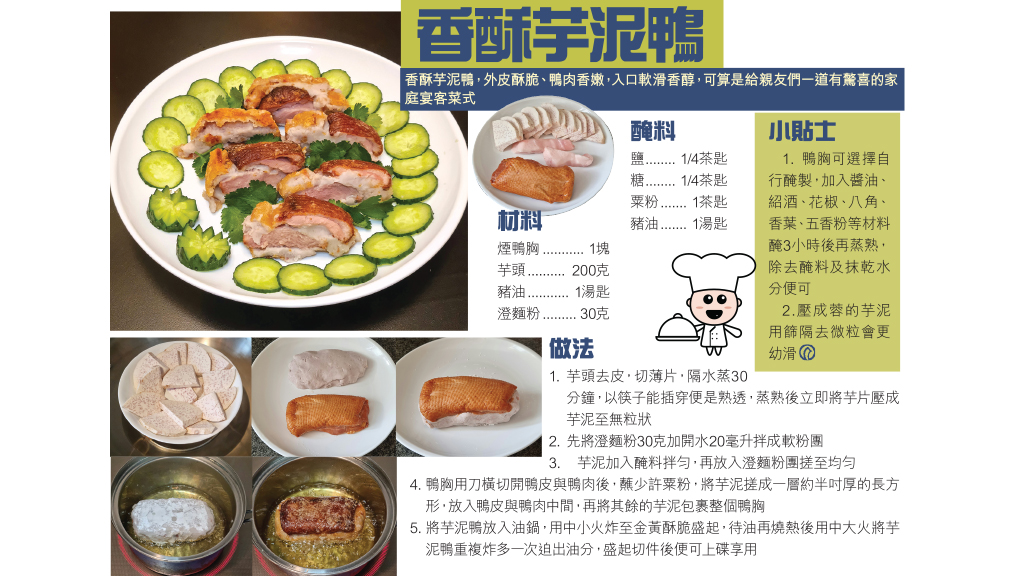 香酥芋泥鴨,外皮酥脆、鴨肉香嫩,入口軟滑香醇,可算是給親友們一道有驚喜的家庭宴客菜式
