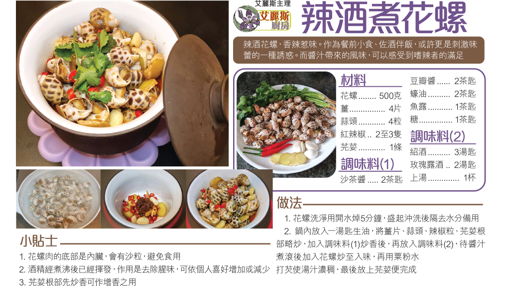 辣酒花螺,香辣惹味。作為餐前小食、佐酒伴飯,或許更是刺激味蕾的一種誘惑。而醬汁帶來的風味,可以感受到嗜辣者的滿足