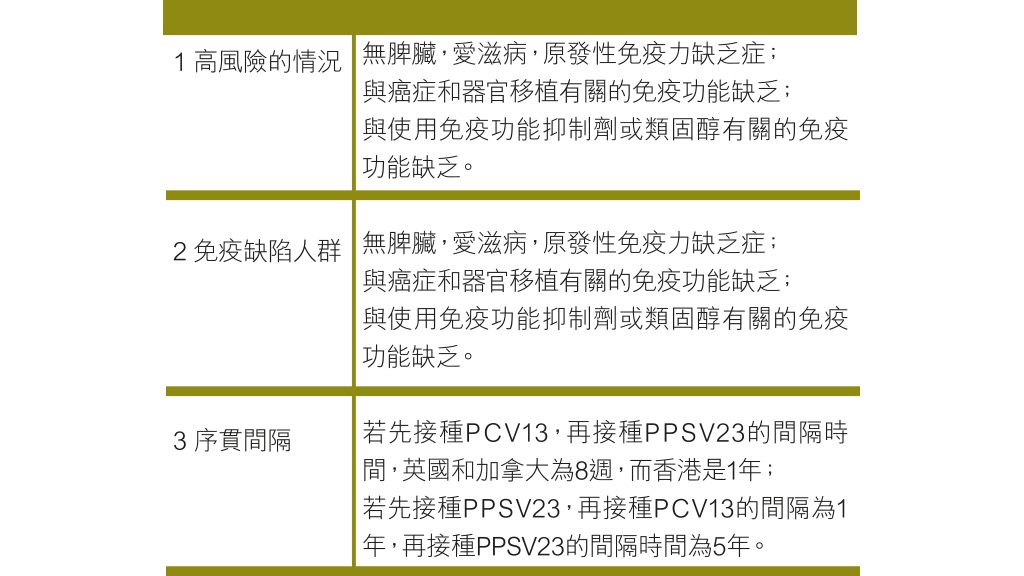各國/地區目前針對長者(65歲及以上)的肺炎鏈球菌疫苗接種指南有些許差異,主要區別於是否需要序貫接種PPSV23及PCV13,還是僅接種一種即可。