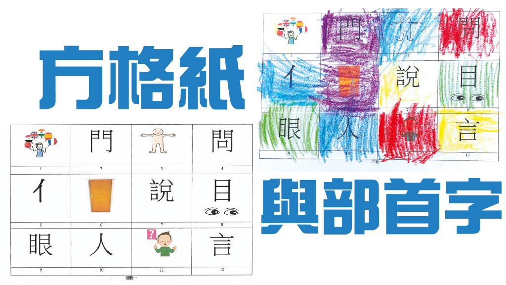 幼兒初學漢字是記憶整體的字形,當幼兒認識了一些基本的漢字之後,這些基本漢字也是組合字的「部首」,因此,幫助幼兒辨別由「部首」組合的漢字,有助他們容易記憶新字彙,例如,「晴」字由左、右的「部首」構成,左邊「部首」的「日」字蘊含太陽的意思和右邊「部首」的「青」字代表清楚的意思,「晴」字的意思是「太陽出來所以就清楚了」。可是當一些基本的漢字拼寫成組合「部首」字時,該字的字形就有所改變,例如,「扌」剔手旁及「忄」豎心旁與基本漢字字形的「手」和「心」有很大差別,假若學生不熟習漢字字形及意思,較難懂得明白這些「部首」字,筆者認為增加學習「部首」與這些基本漢字字形的連繫,可以幫助學生容易記憶新字彙的字形及意思。四歲的桐桐喜歡填色遊戲,筆者把桐桐學習的新字彙包括「們」、「眼」、「說」的「部首」字及圖畫,以方格紙填色遊戲方式展現出來,讓桐桐重溫他已經學習過的基本漢字,桐桐可以選擇喜歡的顏色,把有關連的字及圖填上相同顏色,幼兒享受做手工的創作過程,並同時學習漢字。