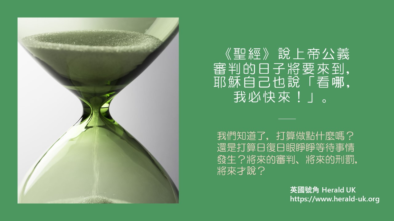 《聖經》說上帝公義審判的日子將要來到,耶穌自己也說「看哪,我必快來!」。我們知道了,打算做點什麼嗎?還是打算日復日眼睜睜等待事情發生?將來的審判、將來的刑罰,將來才說?