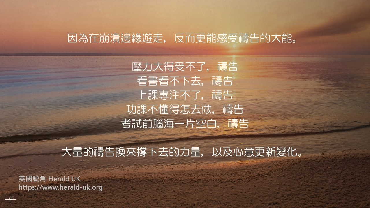 因為在崩潰邊緣遊走,反而更能感受禱告的大能。壓力大得受不了,禱告;看書看不下去,禱告;上課專注不了,禱告;功課不懂得怎去做,禱告;考試前腦海一片空白,禱告。大量的禱告換來撐下去的力量,以及心意更新變化。天父提醒,讀書的本意是為了學習。要是時間不夠,大不了重讀。重要的是,當中要學的是否真的學到,不在乎成績、也不在乎功名。心態改變,眼目重新對焦,內心的平靜安穩便隨之而來。