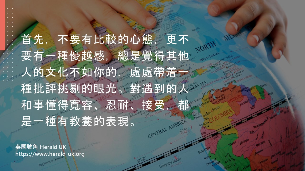 首先,不要有比較的心態,更不要有一種優越感,總是覺得其他人的文化不如你的,處處帶着一種批評挑剔的眼光。對遇到的人和事懂得寬容、忍耐、接受,都是一種有教養的表現。