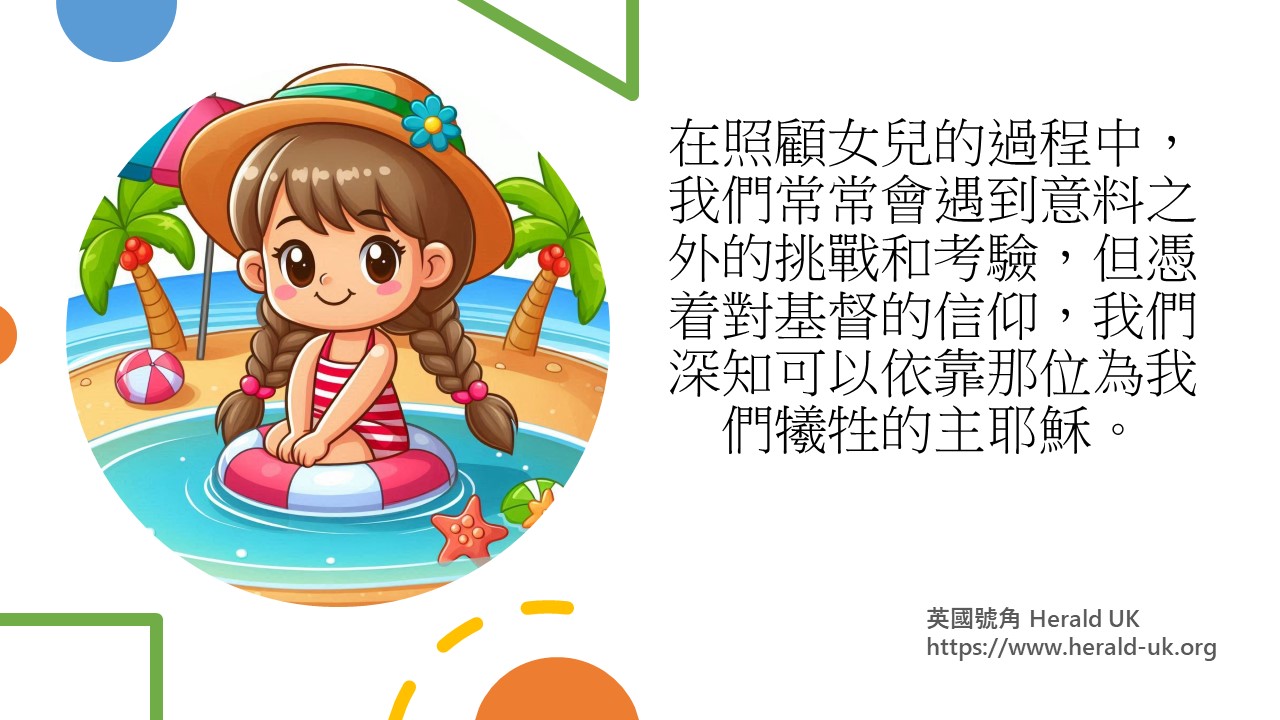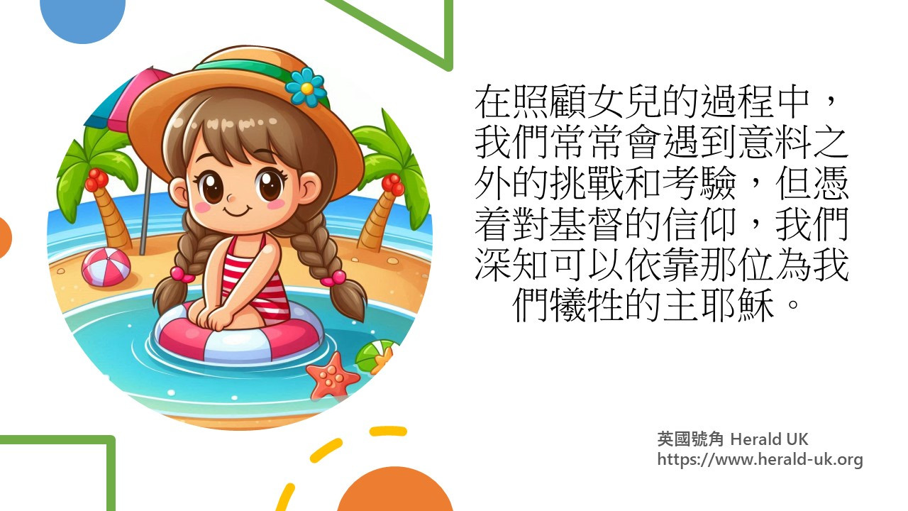在照顧女兒的過程中,我們常常會遇到意料之外的挑戰和考驗,但憑着對基督的信仰,我們深知可以依靠那位為我們犧牲的主耶穌。正如《聖經》所說,「在這一切事上,靠着愛我們的主,已經得勝有餘了。」隨着女兒即將升上小學一年級,我們確信主的恩典必將繼續引領和扶持我們走過每一步。