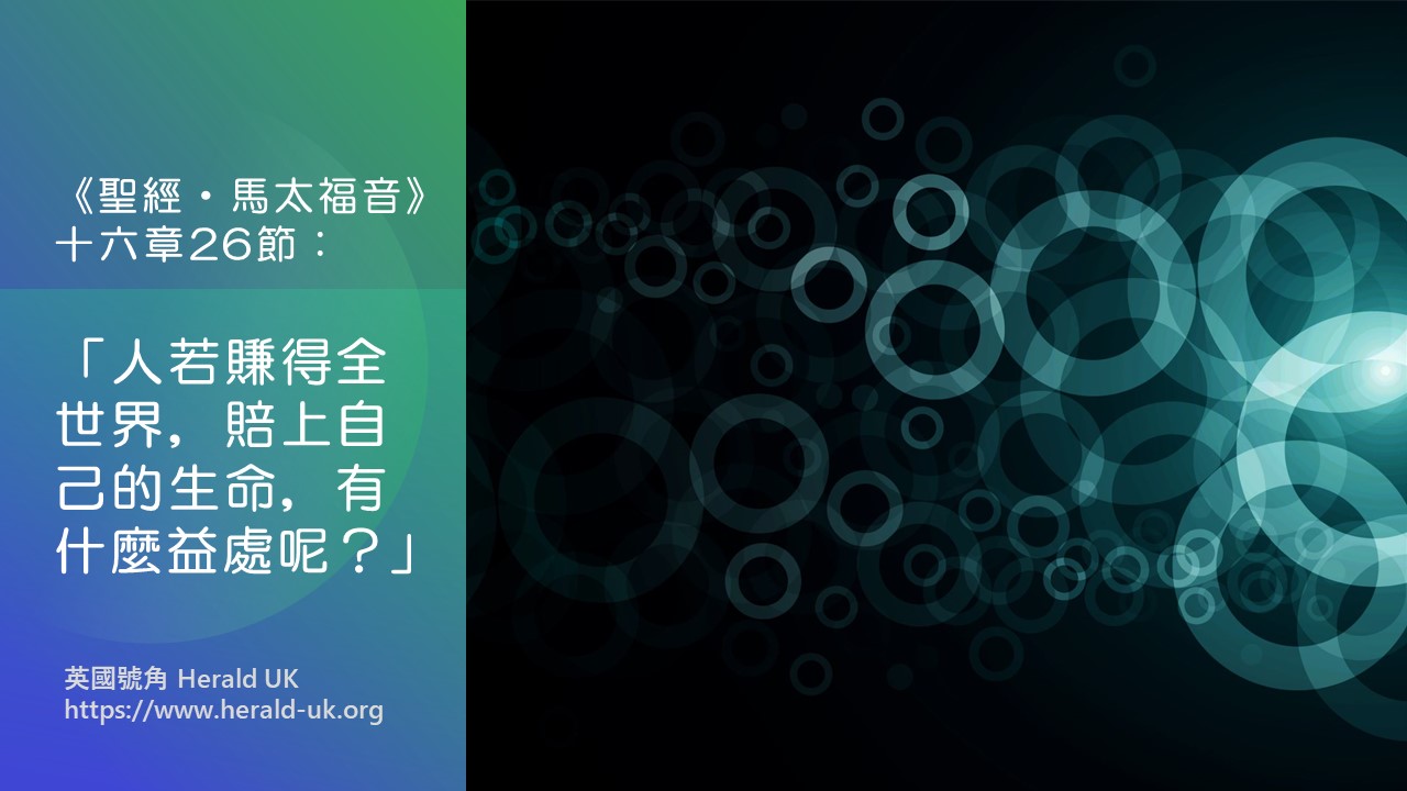 《聖經•馬太福音》十六章26節:「人若賺得全世界,賠上自己的生命,有什麼益處呢?」