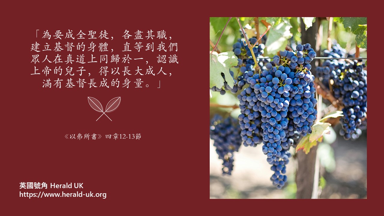 基督徒的屬靈生命,有賴於三位一體的上帝同在,我們每週主日來崇拜,盡基督徒的本分,好像天然食物的維生素,吃後便能供應身體的需要,我們還要一些屬靈的補充劑,例如參與教會服侍、團契聚會,多作善行。除了參與各項主要聚會和事奉之外,個人靈修、讀經和奉獻,就像獲得屬靈的補充劑,其實兩者不可或缺,才對我們屬靈有健康的成長。《以弗所書》四章12-13節:「為要成全聖徒,各盡其職,建立基督的身體,直等到我們眾人在真道上同歸於一,認識上帝的兒子,得以長大成人,滿有基督長成的身量。」主食當然重要,但補充劑同樣對我們有重要的幫助。願我們身體健康,靈性也健康成長。